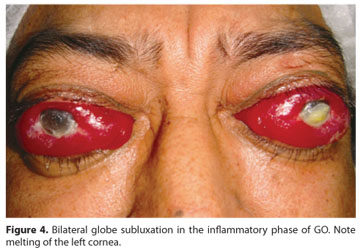 In Graves' orbitopathy (GO) eye subluxation is associated with the lipogenic pole of the disease which involves patients with almost normal extraocular muscles (EOM), increased volume of orbital fat and high degrees of proptosis(10). In these patients the subluxation is transient and easily managed with manual eye repositioning(2). Globe subluxation in the setting of the active phase of the myogenic type of GO is an extremely serious and different situation that is rarely mentioned in the ophthalmic literature. We are aware of just one of case reported in Israel(11).