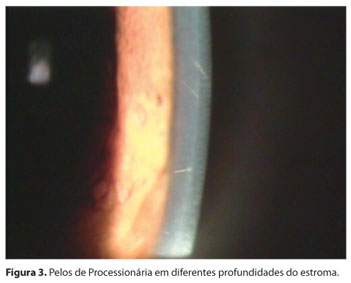 Caso 2: Doente de 28 anos de idade, sexo masculino, recorre ao SU por dor intensa no olho direito acompanhada de hiperemia conjuntival. Referia contato ocular direto com lagarta, ao realizar limpeza florestal. Apresentava MAVC - OD: 0,6 e OE: 1,0 e a presença de múltiplas erosões puntiformes corneanas que correspondiam aos pontos de entrada de filamentos alaranjados (quantificados em mais de 20) a diferentes profundidades da córnea, alguns atravessando a Descemet (Figura 3). Não eram visíveis corpos estranhos intraoculares mas apresentava Tyndall (+++).