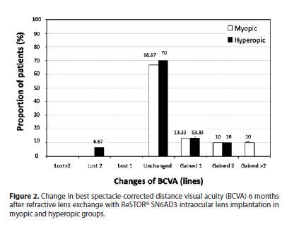 Several studies have shown that the RLE and IOL implantation in the posterior chamber gives good safety, predictability, and efficacy outcomes and that the postoperative improvements in visual acuity are stable throughout a long follow-up period(2-9). In the current study, the safety index was good and similar for both the myopic and hyperopic groups (1.05 and 1.01, respectively). Only two eyes (6.67% of the eyes) in the hyperopic group lost 2 lines of BCVA, all the others maintaining or improving BCVA in both groups. There was no statistically significant difference between pre and postoperative BCVA in hyperopic group (p=0.49), however we found statistically significant difference in the myopic group (p=0.02). Magnification and minimization of the retinal image in myopic and hyperopic patients, respectively, may play a significant role in this difference. Fernandez-Vega et al.(9), studied the spherical ReSTOR® SA60D3 IOL in 224 eyes of 112 consecutive patients and found similar results of safety indexes in myopic and hyperopic groups (1.05 and 1.02, respectively). Thirty per cent and 23% of patients gained ≥1 lines of BCVA in the myopic and hyperopic groups, respectively. In a previous clinical study in which the authors studied 68 eyes implanted with Array multifocal IOL, they found that no eye in the myopic group and 3 eyes in the hyperopic group sustained a loss of 1 line of BCVA. Eighty-two percent of patients (41 eyes) remained unchanged, 10% (5 eyes) had a gain of 1 line, and 2% (1 eye) had a gain of 2 lines of BCVA(8).