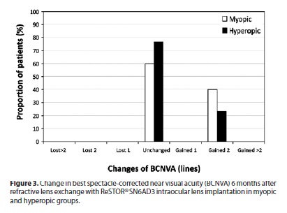 Table 3 summarizes monocular visual acuity results obtained for near vision. None of the examined eyes in both groups lost lines of BCNVA 6 months after the surgery (see Figure 3). Twelve eyes (40%) in the myopic group and 7 eyes (23.3%) in the hyperopic group gained lines of BCNVA (p=0.27).