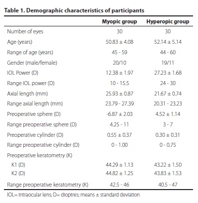 Sixty eyes of 30 patients had clear lens exchanged with ReSTOR® SN6AD3 IOL. Patients' demographics are shown in table 1. Patients were divided into two groups, myopic (n=15, 10 female, 5 male) with an average preoperative SE refraction of -6.87 ± 2.03 D (range -4.25 to -11.00 D), and hyperopic (n=15, 9 female, 6 male) with an average preoperative SE of +4.52 ± 1.14 D (range +3.00 to +7.00 D). All patients were available for examination at 6 months. No statistically significant differences were found between groups for age (p=0.28) and gender distribution (p>0.99).