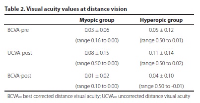 Table 2 summarizes monocular visual acuity results obtained for distance vision. There were no statistically significant differences between pre and postoperative BCVA in the hyperopic group (p=0.49), but significant differences were found for the myopic group (p=0.02).