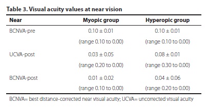 RESULTS: After surgery, uncorrected visual acuity was 0.08 ± 0.15 and 0.11 ± 0.14 logMAR for the myopic and hyperopic groups, respectively (50% and 46.67% of patients had an uncorrected visual acuity of 20/20 or better in the myopic and hyperopic groups, respectively). The safety and efficacy indexes were 1.05 and 0.88 for the myopic and 1.01 and 0.86 for the hyperopic groups at distance vision. Within the myopic group, 20 eyes remained unchanged after the surgery, and 3 gained >2 lines of best corrected visual acuity. For the hyperopic group, 2 eyes lost 2 lines of best corrected visual acuity, 21 did not change, and 3 eyes gained 2 lines. At near vision, the safety and efficacy indexes were 1.23 and 1.17 for the myopic and 1.16 and 1.13 for the hyperopic groups. Best corrected near visual acuity improved after surgery in both groups (from 0.10 logMAR to 0.01 logMAR in the myopic group, and from 0.10 logMAR to 0.04 logMAR in the hyperopic group).