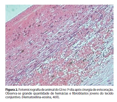 1. Grupo I - 7 dias - quadro de reparação tecidual aguda, caracterizado por tecido necrótico e regenerativo, edema, rede de fibrina, grande quantidade de fibroblastos jovens e hemácias, emigração de células inflamatórias, principalmente polimorfonucleares (neutrófilos e alguns eosinófilos) (Figura 2).