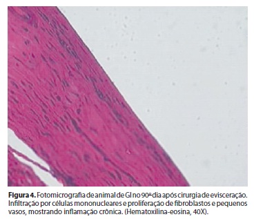 A evisceração do olho é reparada por tecido conectivo e fibrose, com contração cicatricial do tecido escleral, reduzida pela colocação de implantes. Qualquer material estranho que seja implantado em um organismo vivo, leva à formação de uma pseudocápsula, composta inicialmente por uma rede de fibrina que evolui para fibroblastos jovens, presença de células leucocitárias, hemácias e neovasos. As células inflamatórias, inicialmente leucócitos, aprisionam e degradam bactérias, corpos estranhos e os detritos de células necróticas. Mediadores químicos e radicais tóxicos são liberados e podem prolongar a inflamação e aumentar o dano tecidual. Com o passar do tempo, a resposta inflamatória aguda passa para a fase crônica, com predomínio de outras células, associadas com macrofagia, proliferação de pequenos vasos sanguíneos e tecido conectivo e os fibroblastos jovens se tornam maduros. Estas mudanças caracterizam o processo de cicatrização, com substituição do tecido lesado por tecido conjuntivo(17-19), e foram observadas ao longo do nosso período experimental, de forma semelhante a que acontece com implantação de outros materiais em cavidades anoftálmicas(4,11,20).