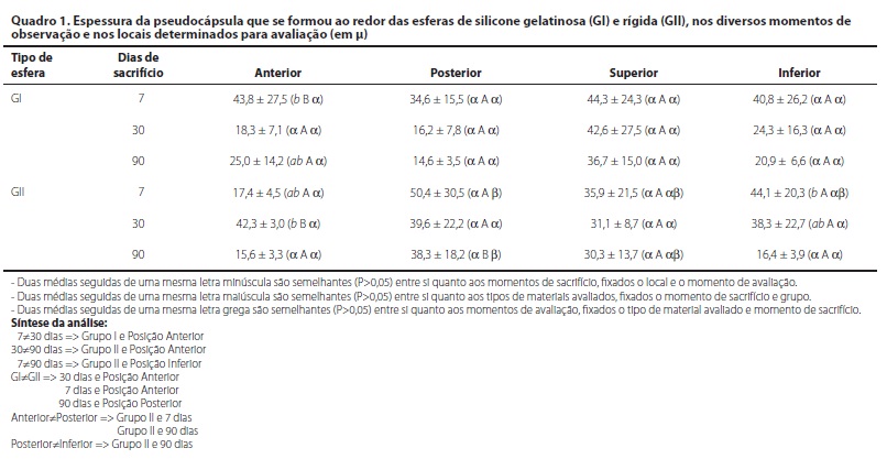 Exame morfométrico: houve redução da espessura da pseudocápsula ao longo do experimento, com valores semelhantes estatisticamente, principalmente quando se avaliou a pseudocápsula das posições posterior e superior. Entretanto, na porção anterior e inferior, esta última, medida que coincidia com o fundo-de-saco inferior, a pseudocápsula era estatisticamente mais espessa na porção anterior no GI aos sete dias e no GII, aos 30 dias. Na posição inferior os grupos GI e GII tiveram pseudocápsula mais espessa aos sete dias, decaindo ao longo do experimento, com diferença significativa apenas no GII. A comparação dos grupos mostrou que no GI a espessura da pseudocápsula foi maior na posição anterior aos sete dias, sem outras alterações estatísticas nos demais locais, em todos os momentos avaliados. No GII, aos 30 dias a espessura foi maior no setor anterior e aos 90 dias a espessura foi maior na porção posterior, sem outras alterações significativas. Comparando-se a espessura da pseudocápsula de animais do GI contra animais de GII, só houve diferença significativa na posição posterior, quando os animais do Grupo II apresentaram espessura da pseudocápsula maior do que observado no GI, em especial aos sete e 90 dias. Ou seja, os animais que tiveram implantação de esferas rígidas (GII) apresentaram pseudocápsula mais espessa que os que receberam esferas gelatinosas (Quadro 1).