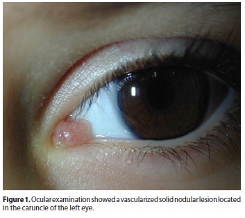A 4 year-old boy presented in our institution with a history of a fast growing (1-month) nodular lesion in the caruncle of his left eye. Slit lamp examination showed a vascularized solid nodular lesion in the semilunar fold (Figure 1). Otherwise ocular examination was unremarkable and no other conjunctival or ocular lesions were observed. Systemic studies were negative.