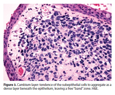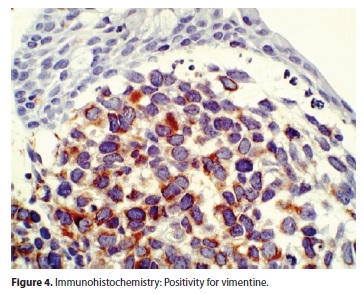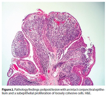 A polipoid lesion, with an intact conjunctival epithelium was seen (Figure 2). There were tumoral cells in the substantia propia, and in some areas they were aggregated as a denser layer beneath the epithelium (Figure 3). At higher magnification the undifferentiated tumor was composed of loosely coherent spindle-shaped cells, some of them with red-staining citoplasms, oriented in various directions. The cellular atypia and pleomorphism were evident, and there was a high proliferative rate (60-70%). Cross striations were not readily visualized. There was an image highly suggestive of lymphatic invasion.