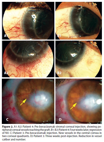 In this study, three patients with post-keratoplasty corneal neovascularization were treated with intrastromal bevacizumab, 2 patients showing reduction of vessels. In these cases of post-keratoplasty neovascularization reaching the graft, injecting bevacizumab directly into the donor button did not cause corneal necrosis, edema or graft rejection. Inhibition of post-operative hemangiogenesis and lymphangiogenesis, by neutralization of VEGF-A, increases corneal graft survival, even after high-risk transplantation(6). It is possible that other cytokines may have contributed to these results, such as matrix metalloproteinases for example, which may be present in the cornea after transplantation and have angiogenic and anti-angiogenic actions under different conditions(2).