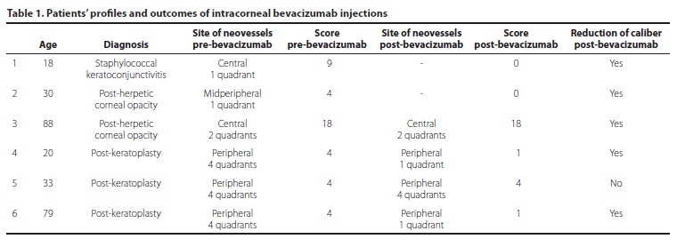 The scoring system used in this paper has not been used in previous studies. Despite not having the ideal scoring system for quantification of corneal neovascularization and documentation of changes in vessels' caliber, our results showed that intracorneal injection of bevacizumab was safe and effective when used for therapy of corneal neovascularization in 6 patients.