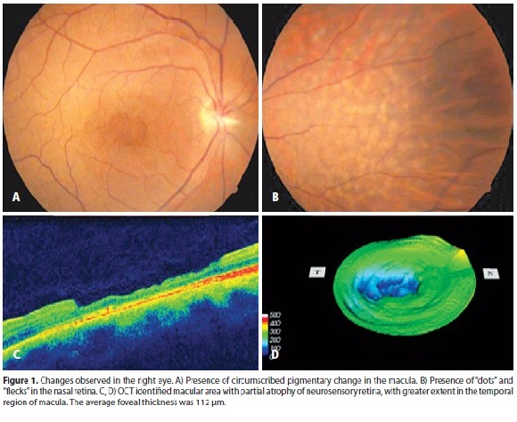 Fluorescein angiography revealed early hyperfluorescence in the well-defined macular region, which did not vary in intensity on late stages in OU. Optical coherence tomography (OCT) identified macular area with partial atrophy of neurosensory retina in OU, with a greater extent in the temporal region of the macula (Figure 1). The average foveal thickness was 112 µm in OD and 99 µm in the OS.