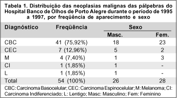 Foram encontrados 54 tumores palpebrais malignos, sendo 41 (75,92%) carcinomas basocelulares (Ca baso), 7 (12,96%) carcinomas espinocelulares (Ca espino), 4 (7,40%) melanomas (Melanoma), 1 (1,85%) carcinoma indiferenciado (Ca indif), 1(1,85%) lentigo maligna (Lentigo) (Tabela 1).