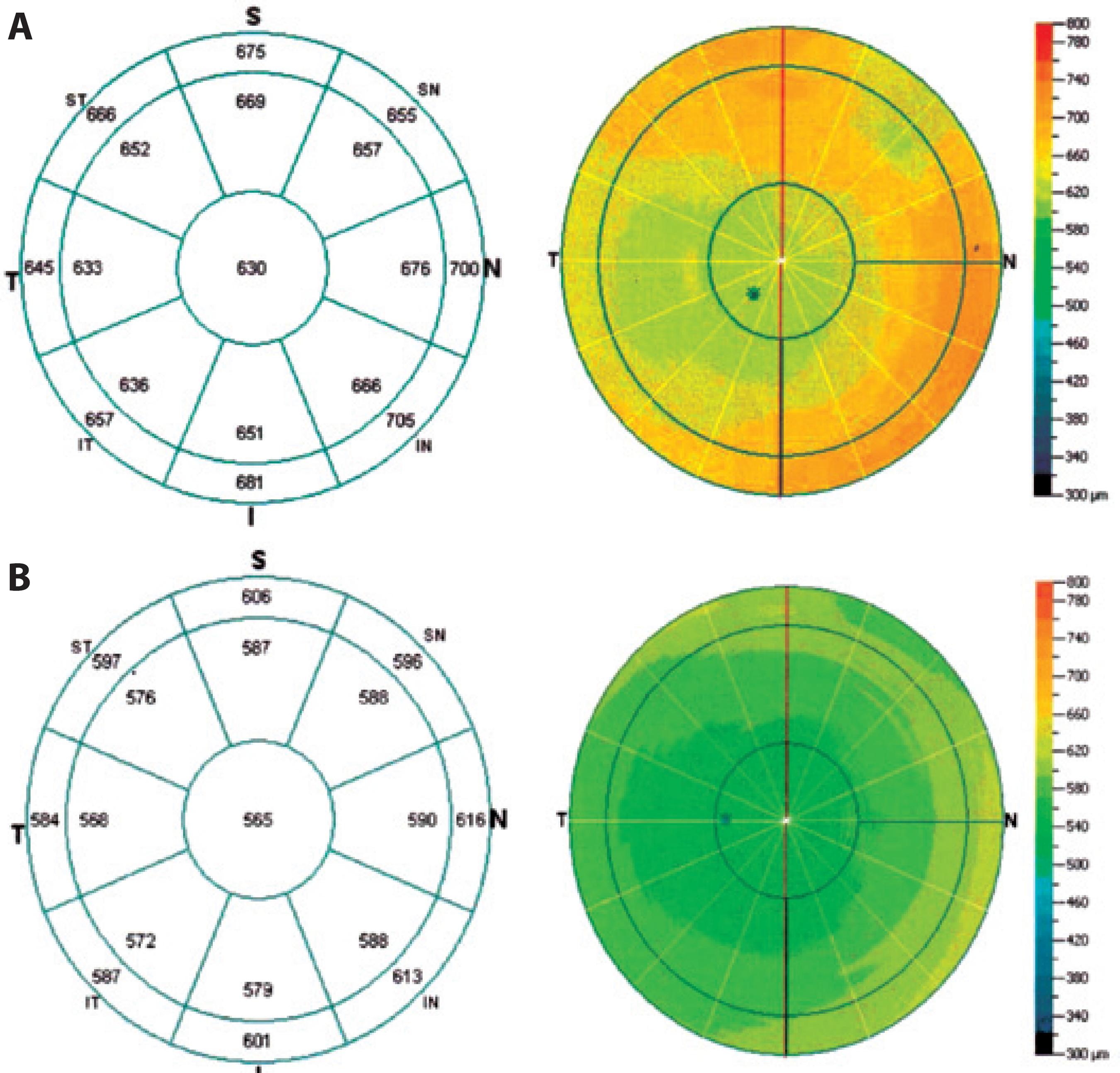 Figure 1 A) Pachymetry map before the start of the treatment. B) Pachymetry map 15 days after the start of the treatment.