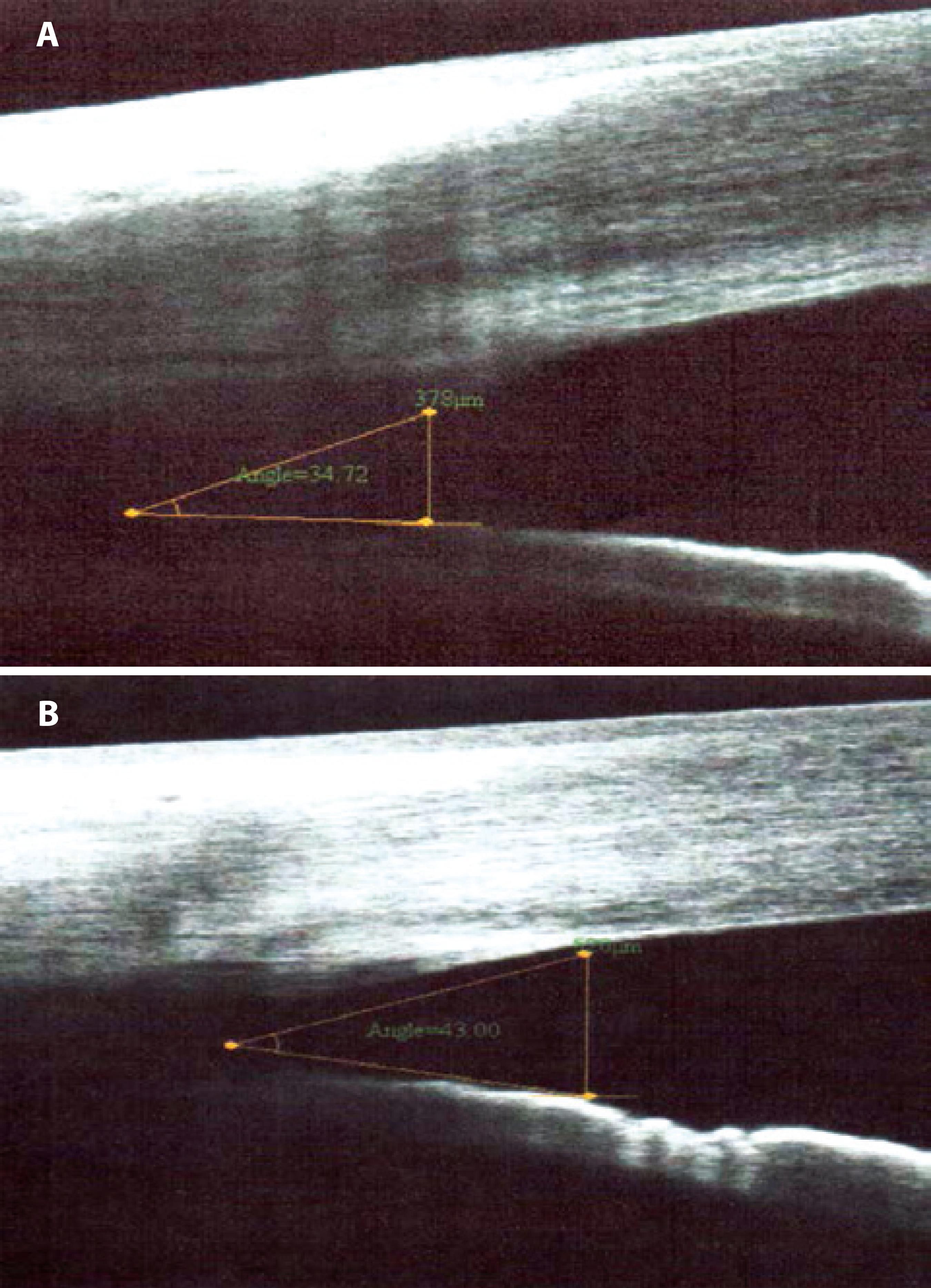 Figure 2 A) Temporal portion of the AC angle viewed on SA-OC before the start of the treatment. B) Temporal portion of AC 15 days after the start of the treatment.