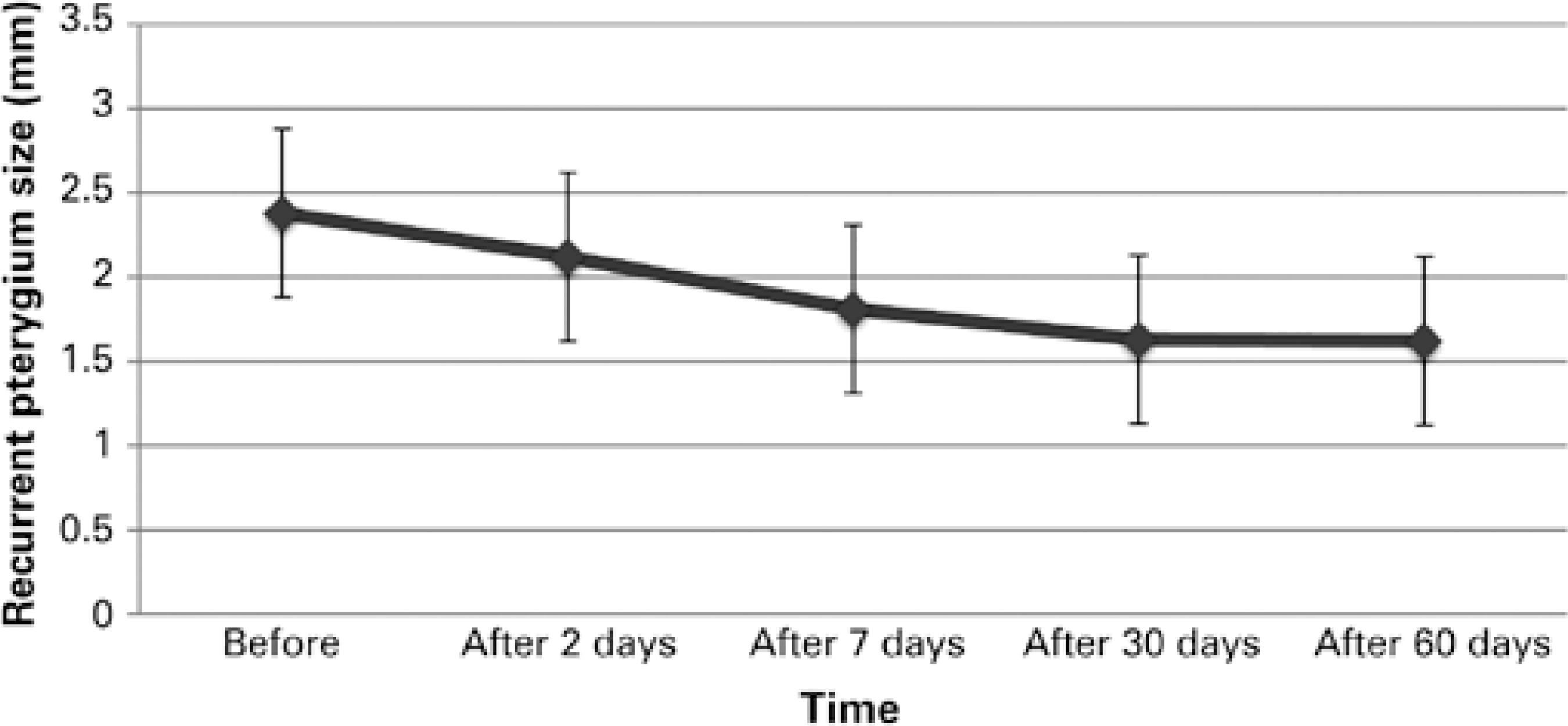Graph 1 There was a significant change in the size of pterygium at different intervals (P<0.05; paired t-test) after the injection of bevacizumab. The mean pterygium size ranged from 2.37 mm to 1.61 mm. These patients were only the treated ones.