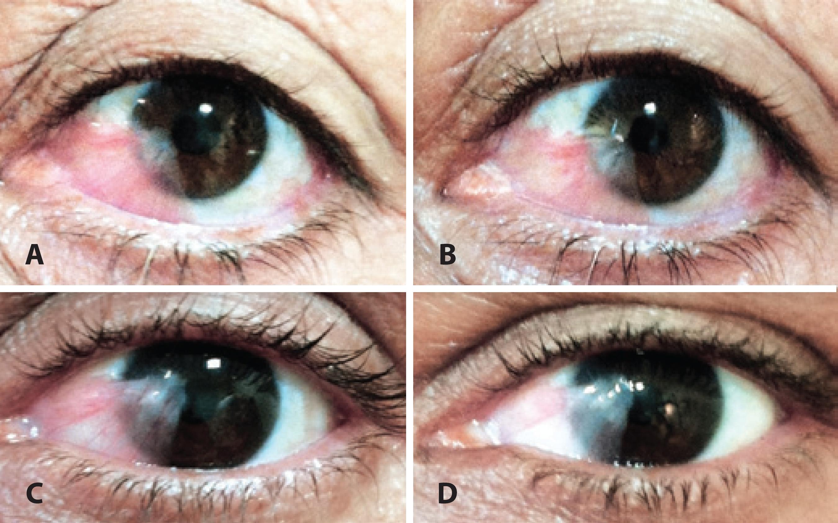 Approximately two-thirds (66.7%) of the patients presented with hyposphagma on the 2nd day after subconjunctival injection; this decreased to 30.6% by day 7 and to 0% at 1 month. Most patients (69.4%) exhibited amelioration of irritative symptoms within 2 days, 88.9% patients after 7 days, and 97.2% after 1 month. The aspect of the recurrent pterygium after injection did not change considerably (Figure 1).