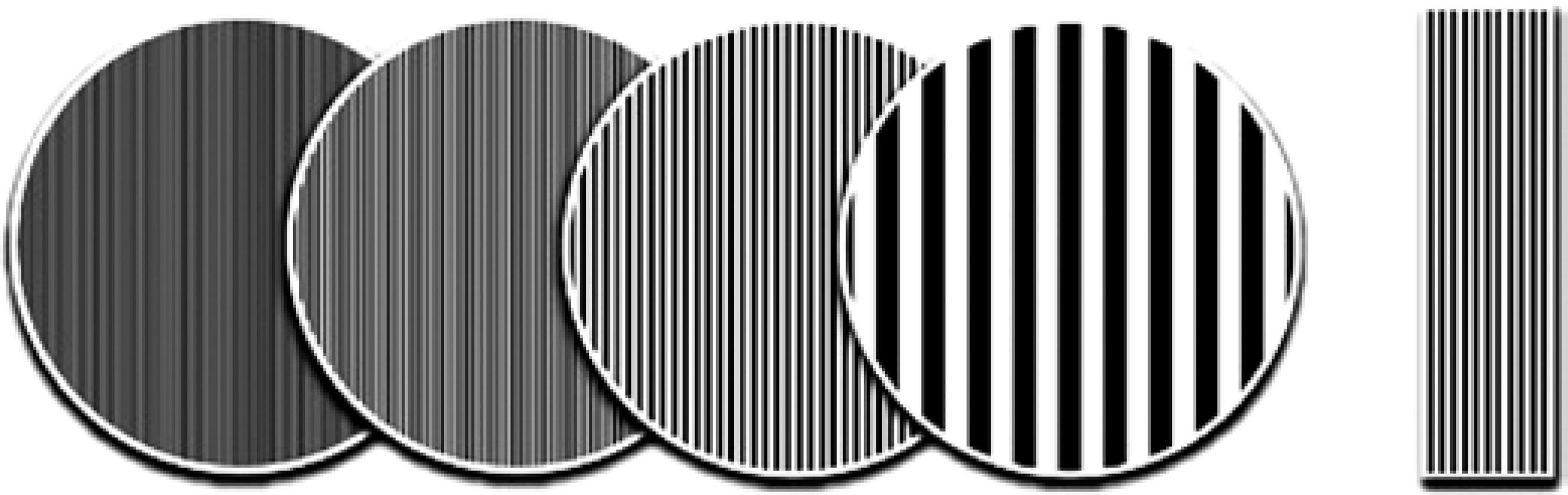 The psychophysical Lea Grating Acuity Test® Model 251300 (Figure 1) was used. In this test, the child detects and directs the gaze toward discs with or without a high visual contrast. The equipment includes four discs with plain gray color on one side and black and white parallel lines on the other, which had the following spatial frequencies: 0.5 cycle per degree of visual angle (cpd), 2 cpd, 4 cpd, and 8 cpd. The discs are 20 cm in diameter and both the patterned and the gray side are shown simultaneously to the children. The aim of the test is to determine the number of discs the child is able to identify(13). The assessment of visual acuity and head posture was performed on the same day and on two separate occasions, with and without the correct postural alignment of the head.