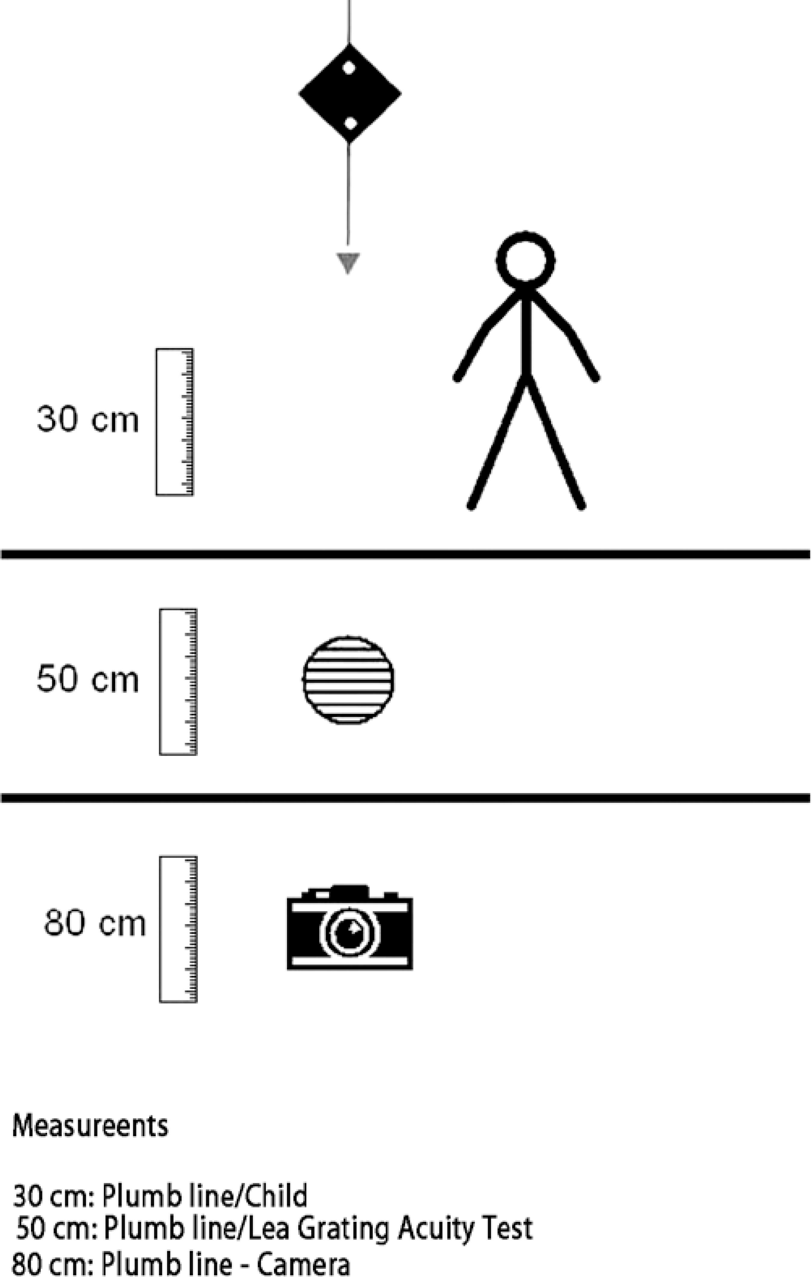 Children stood 30 cm away from the plumb line, with the ear lobes and the right and left acromion visible. The discs were maintained at a distance of 50 cm from the child. The camera was placed on a tripod, at a height of 80 cm and a distance of 80 cm from the plumb line, for the recording of measurements (Figure 2). Using the anterior view, we recorded the head position that blocked nystagmus and the subsequent inclination angles of the head during the performance of the Lea Grating Acuity Test®.