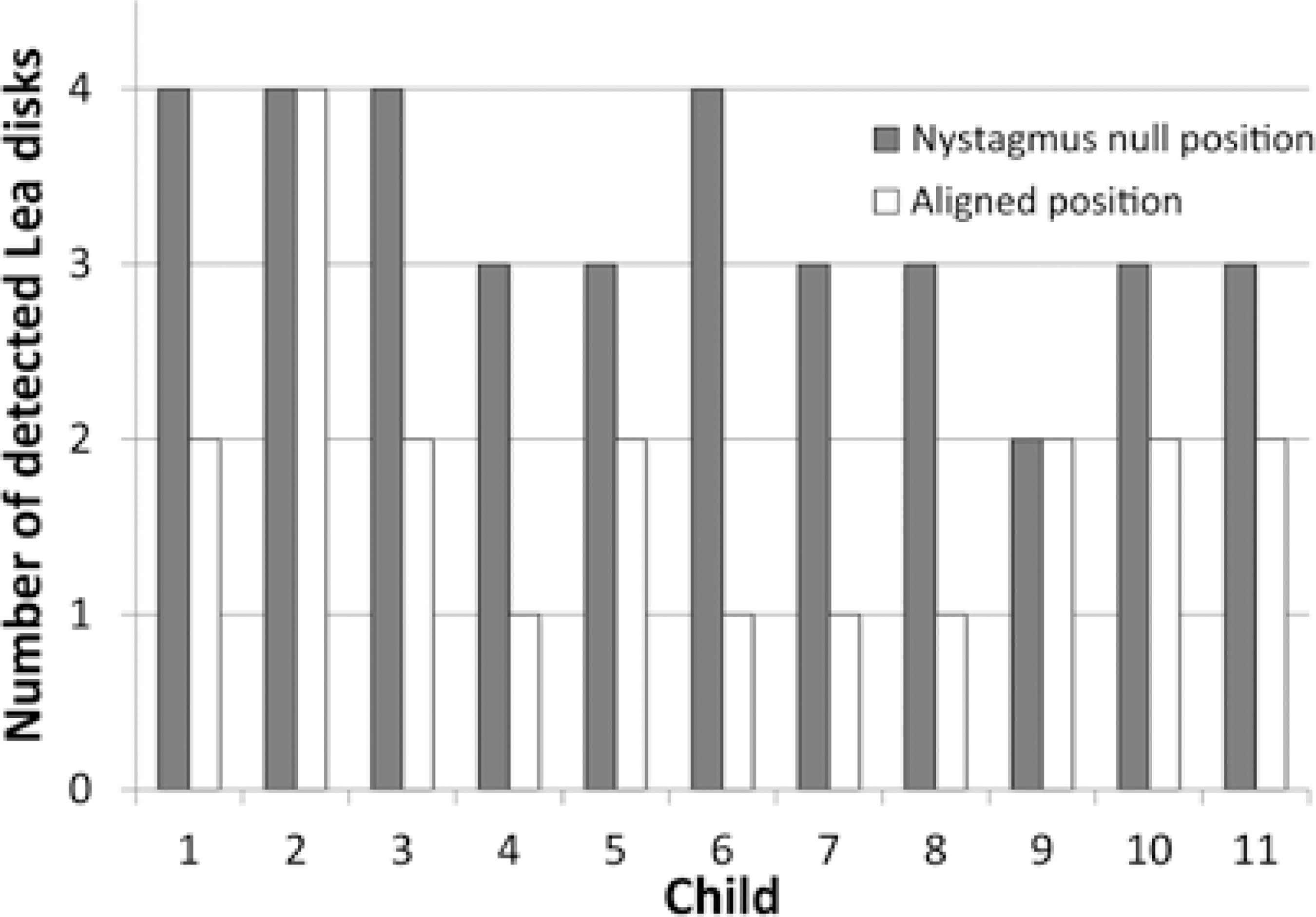 Two children detected the same number of discs in the nystagmus null position and following the postural alignment of the head. One child detected all four discs in both head postures and another detected two discs in both postures.