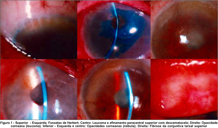 Diallo et al.(6) classificaram as alterações corneanas pós- tracomatosas em 5 tipos: modificação da curvatura e da espessura, modificação da transparência, vascularização corneana residual, alterações da sensibilidade corneana e xerose corneana. Bhatia et al.(7) relataram alterações na curvatura corneana em 141 casos, relacionando-as ao estágio evolutivo da doença, sendo maior o grau de ectasia nos casos mais avançados. Quanto à localização, as opacidades corneanas, podem ser classificadas em periféricas, centrais e difusas(8). Há também relato de ceratite intersticial e degeneração lipídica associadas a glaucoma(9-10). Hardten et al.(11) relataram 2 casos de ceratite ponteada persistente após ceratoconjuntivite por Chlamydia trachomatis, sendo descritas lesões bilaterais acinzentadas e recorrentes em vários níveis no epitélio corneano, bem como edema estromal anterior em um dos casos.