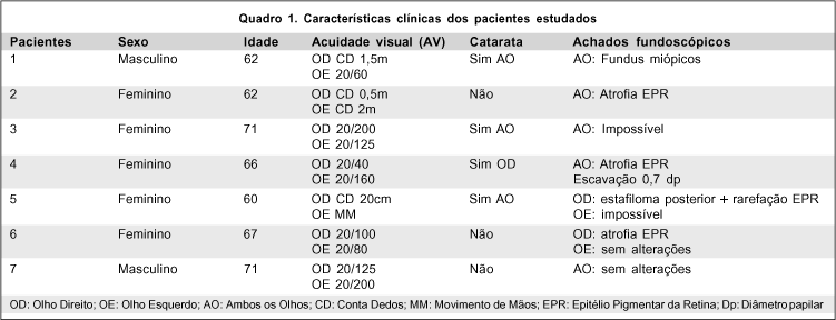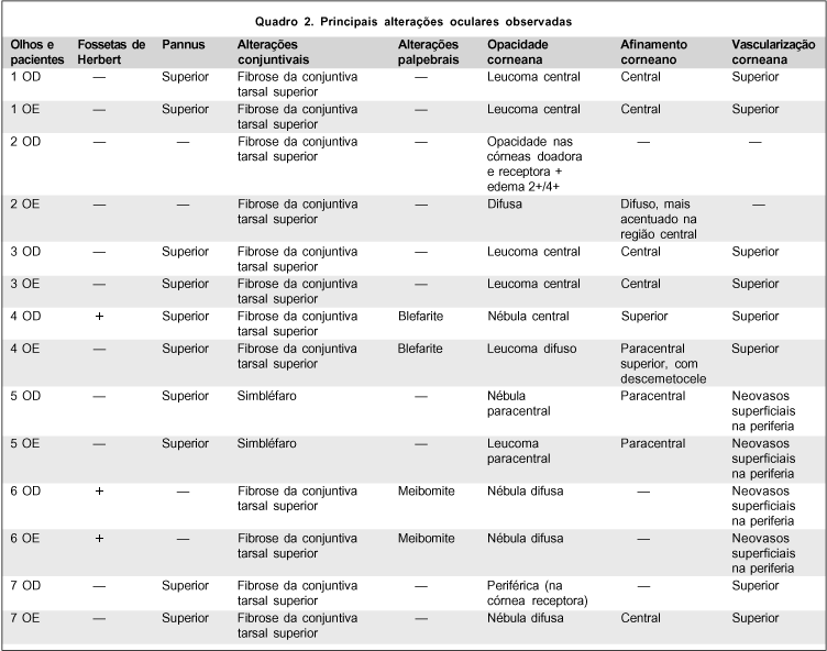Os pacientes deste estudo foram selecionados no ambulatório de Córnea e Doenças Externas da Escola Paulista de Medicina da Universidade Federal de São Paulo. Para o nosso estudo selecionamos pacientes com diagnóstico clínico prévio de tracoma sem deformidades palpebrais, história pregressa de correção de entrópio ou epilação, mas com opacidades e afinamentos corneanos. Estudos laboratoriais não foram realizados, pois nenhum dos pacientes apresentava tracoma inflamatório ou folicular. A avaliação oftalmológica completa incluiu cuidadoso exame biomocroscópico em ambos os olhos dos 7 pacientes.