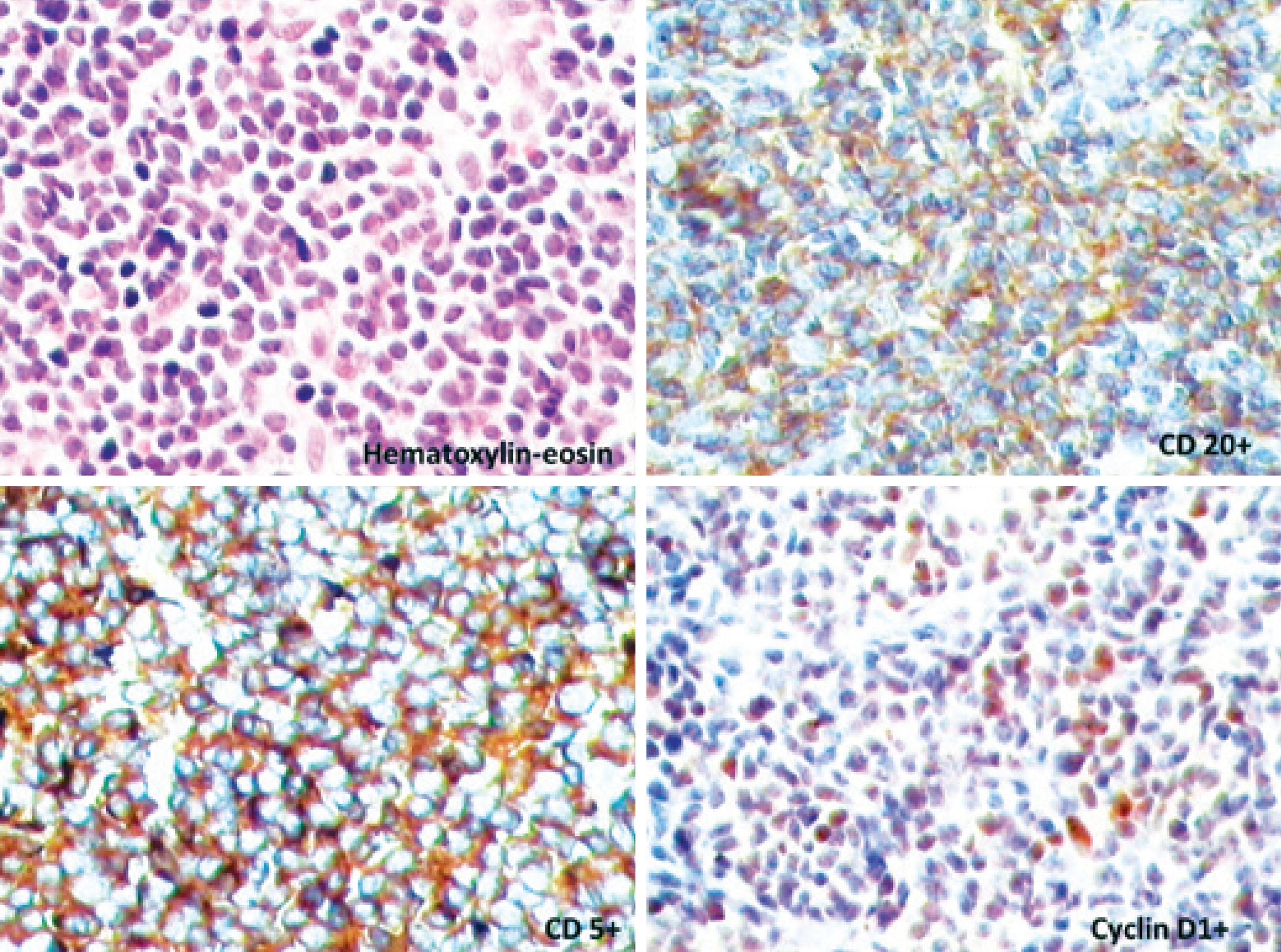 There are some characteristic immunohistochemical markers (CD5+, CD20+, bcl-2+, CD21+ dendritic form, CD43+, CD23-, CD10, CD11c-, and CD25-) and genetic patterns characterized by the translocation t(11;14)(q13,q32), which causes overexpression of the CCND1 gene and the protein cyclin D1(3-5). However, some authors have described atypical cases that were immunohistochemically negative for CD5(3). Coupland et al. showed p16 expression in 2 patients.6 Histologically, this lymphoma is characterized by small cells with irregular and hyperchromatic nuclei and scant cytoplasm(6).