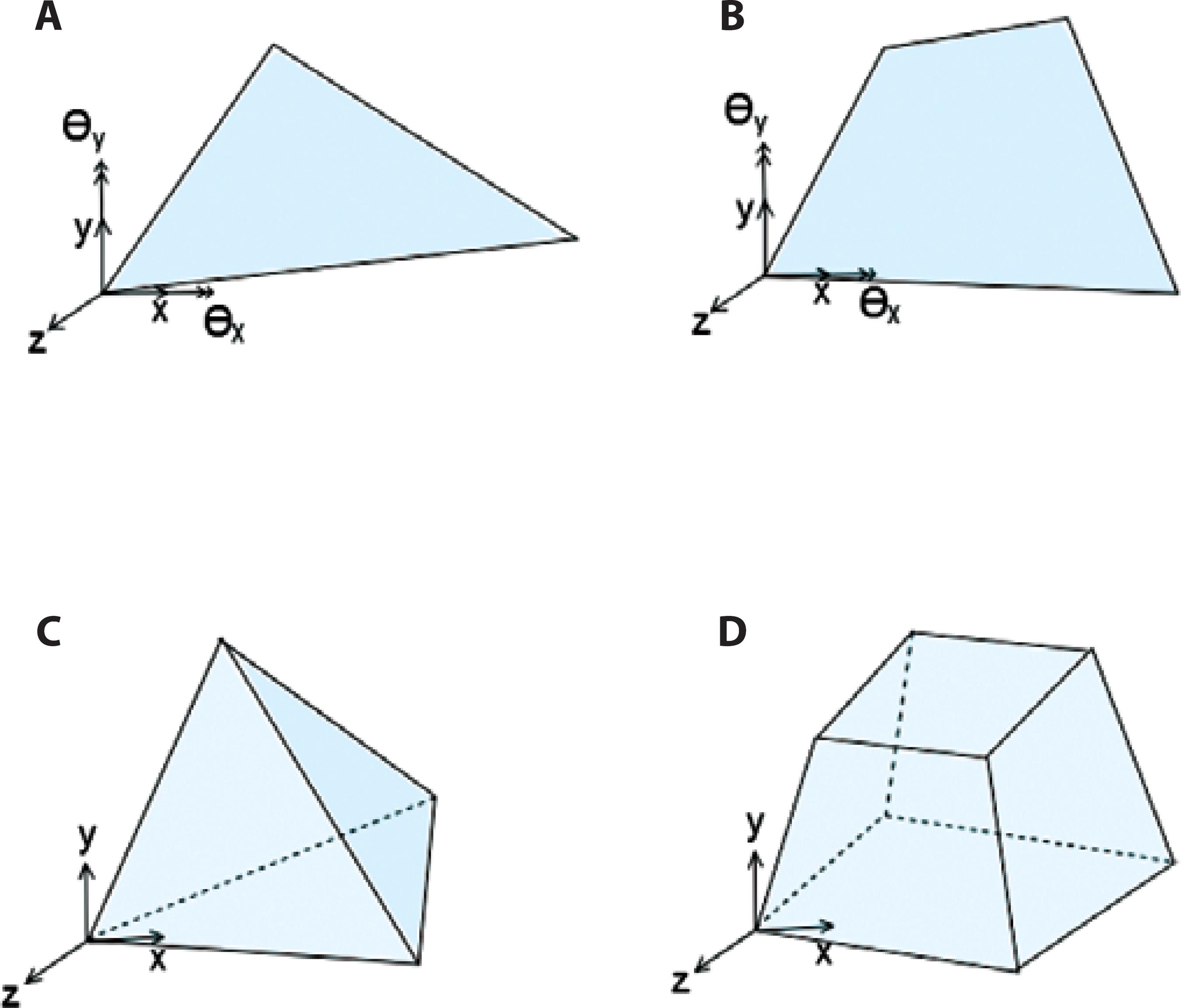 Figure 1 Common shell and solid elements used for finite element analysis (FEA) of the cornea. A) Triangle and B) quadrilateral are common shell elements. Each shell element node has 5 degrees of freedom (DOF): 3 translational and 2 rotations (approximately 2 orthogonal axes on the shell surface). C) Tetrahedral and D) hexahedral are common 3D elements. Each element node has 3 translational DOF.
