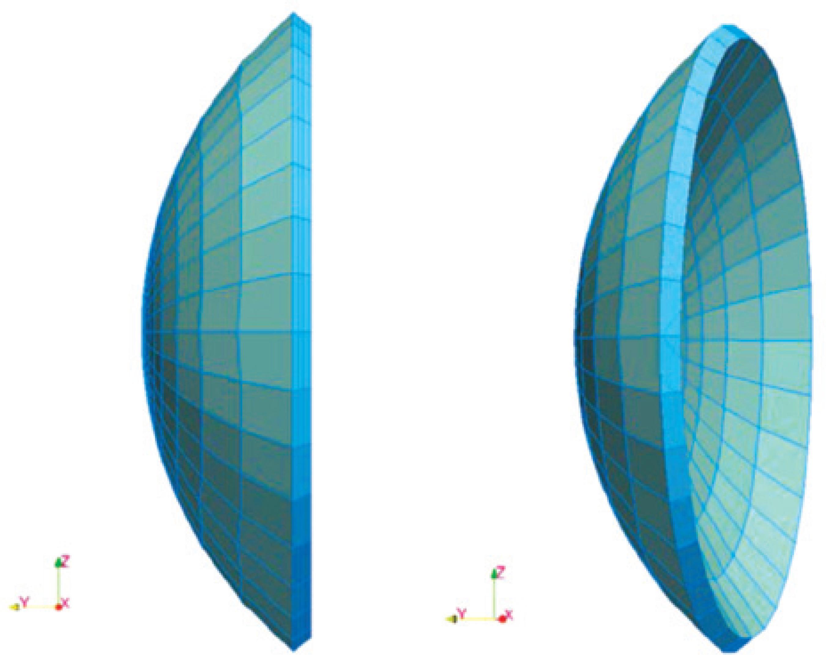 Pandolfi and Holzapfel(2) used the corneal geometry data published by Dubbelman et al.(28) to create biconic interior and exterior surfaces for a 3D corneal model. Pandolfi and Manganiello(10) used an ellipsoidal shape to define the anterior and posterior corneal surfaces. Nguyen et al.(30) and Nguyen and Boyce(31) also approximated the corneal surface to be ellipsoidal according to digital image correlation (DIC) measurements of the corneal surface profile. Buzard(32) and Howland et al.(24) used axisymmetry to create their corneal models.