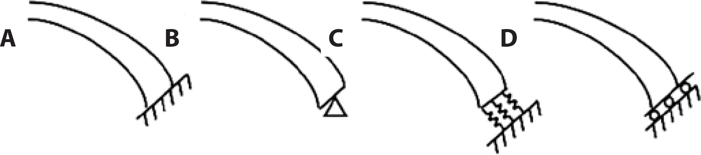 Figure 3 Schematic of boundary conditions at the limbus used by researchers. A) The cornea is constrained against displacement and rotation, as proposed in(5). B) The cornea is fixed against displacement, but may rotate at the edges, as in(2). C) Springs normal to the cross-section. Researchers in(13) investigated boundary conditions (a), (b), and (c). D) The cornea is allowed to expand along a given surface, as in(11, 23, 37, 38). Forty degrees from horizontal is taken as a typical angle.