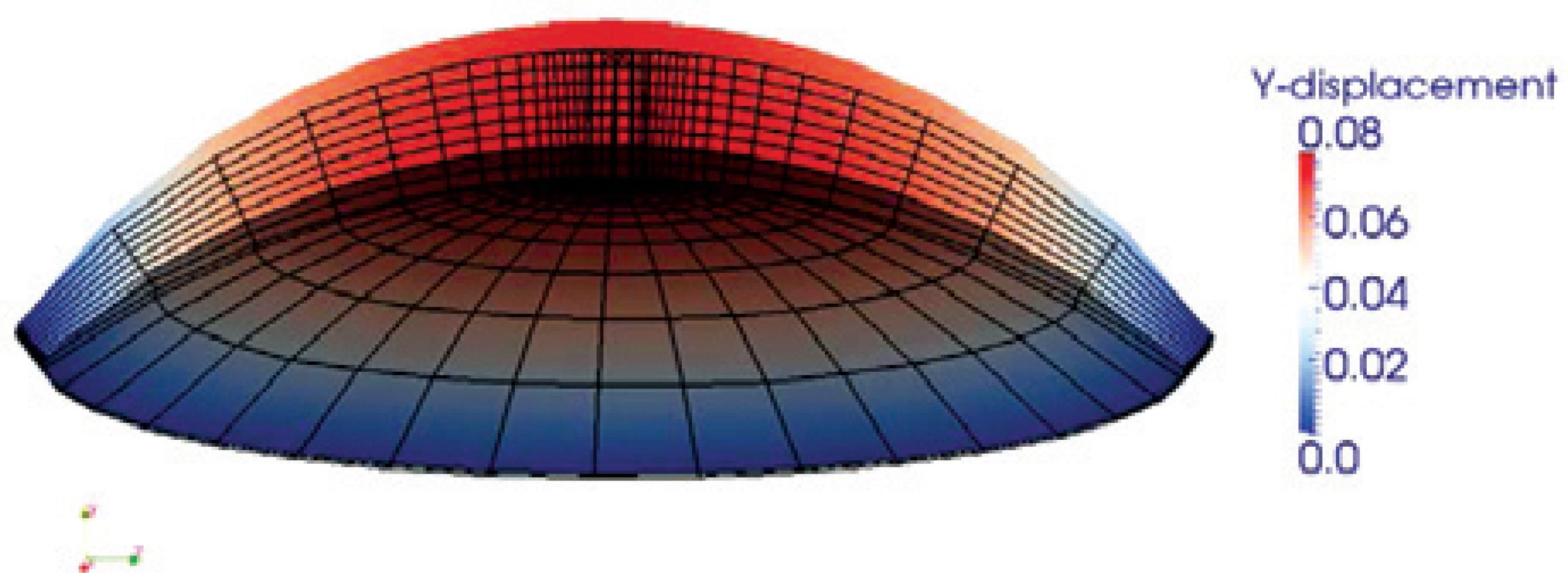 Figure 4 An example of vertical displacement mapping of a mouse cornea subjected to intraocular pressure (IOP) obtained from finite element (FE) simulations is shown in the cross-section. The wireframe on the bottom is the undeformed mesh, and vertical displacement colored by magnitude is shown on top. The corneal displacement, but not rotation, is restricted along the limbus.