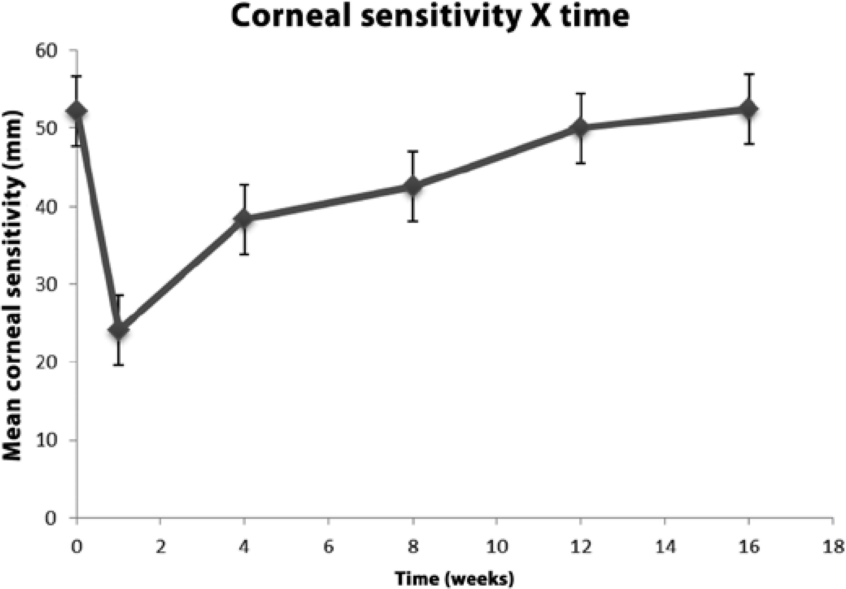 Many corneal surgical procedures have been associated with a temporary decrease in corneal sensitivity due to amputation or laser ablation of the corneal nerves. This damage may contribute to the development of dry eye, impaired epithelial wound healing, increased epithelial permeability, and ocular surface changes after the procedure. In such cases, the corneal sensitivity usually returns to normal within 3-12 months after surgery(9,13).
