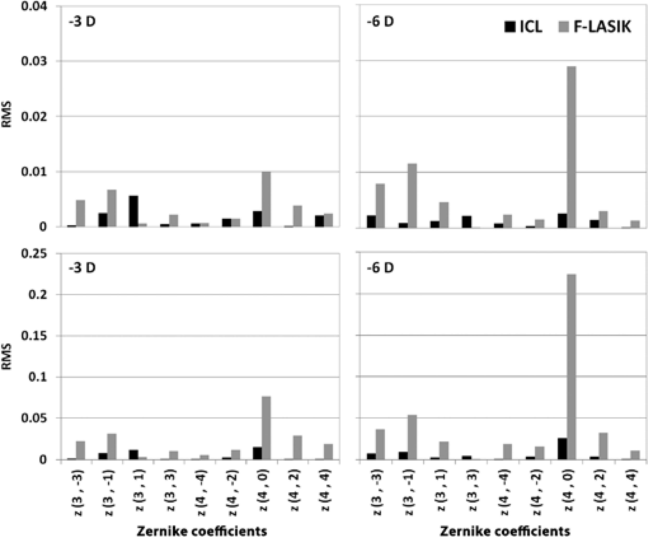 Figure 1 shows the Zernike coefficients of ICL implantation and the Zernike coefficients obtained with F-LASIK (aberrations after surgery - aberrations before surgery) for both pupils.