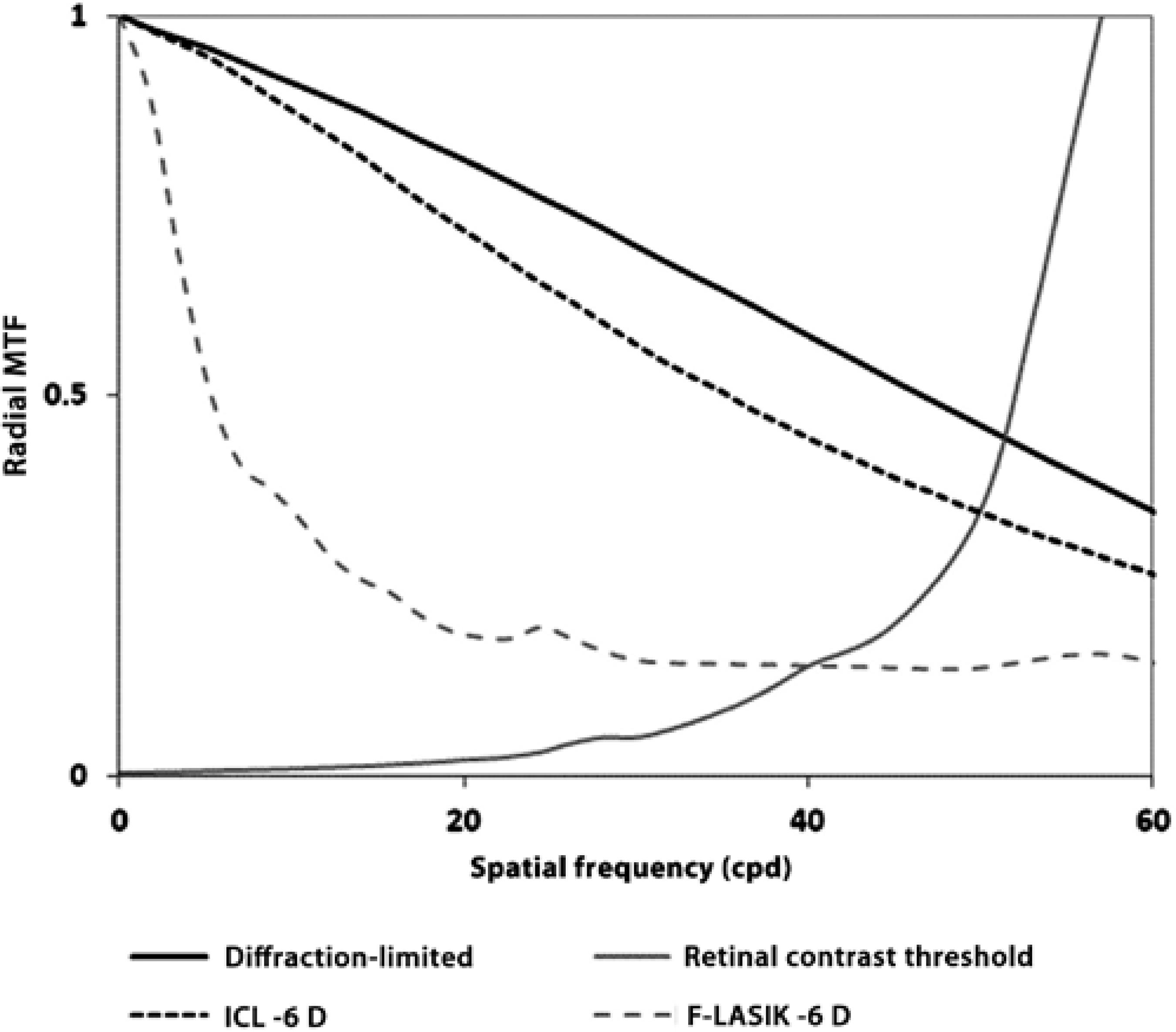 Figure 2 Radial projection, averaged over all orientations, of the two-dimensional modulation transfer function (MTF) for 780 nm versus spatial frequency (cycles/deg) for a 5-mm pupil and -6 D with ICL implantation (black dashed line) and with femtosecond laser in situ keratomileusis (F-LASIK) (gray dashed line). Diffraction-limited (black line) and retinal contrast threshold curves at a retinal illuminance of 500 td are included (gray line). Error bars are omitted for clarity; the deviation of the modulation transfer at any spatial frequency was typically 10% of the mean value.