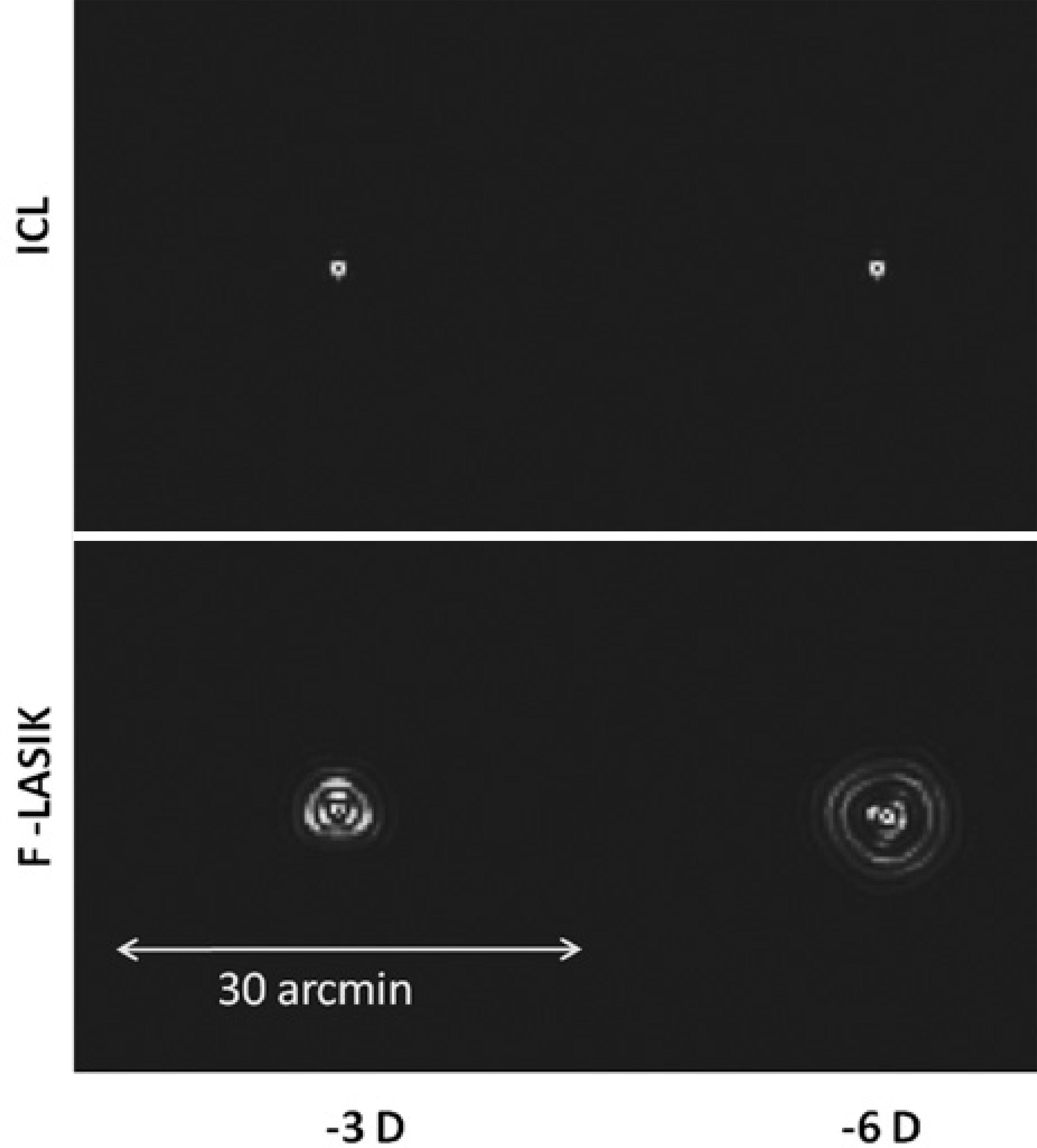 MTF shows how the optical system transmitted spatial frequencies. The loss of high frequencies indicates a loss of information regarding the details of an object, thus decreasing the image quality and VA. For -6-D, F-LASIK-MTF was worse than ICL-MTF, which was close to the diffraction-limited MTF, and therefore provides a better optical quality (Figure 2). These results agree with the calculated RMS values of the Zernike coefficients and PSF images (Figure 3). The PSF images after F-LASIK were worse than those after ICL implantation for both -3 D and -6 D. Note in the F-LASIK PSF images that the increase in spherical aberration is nicely illustrated.