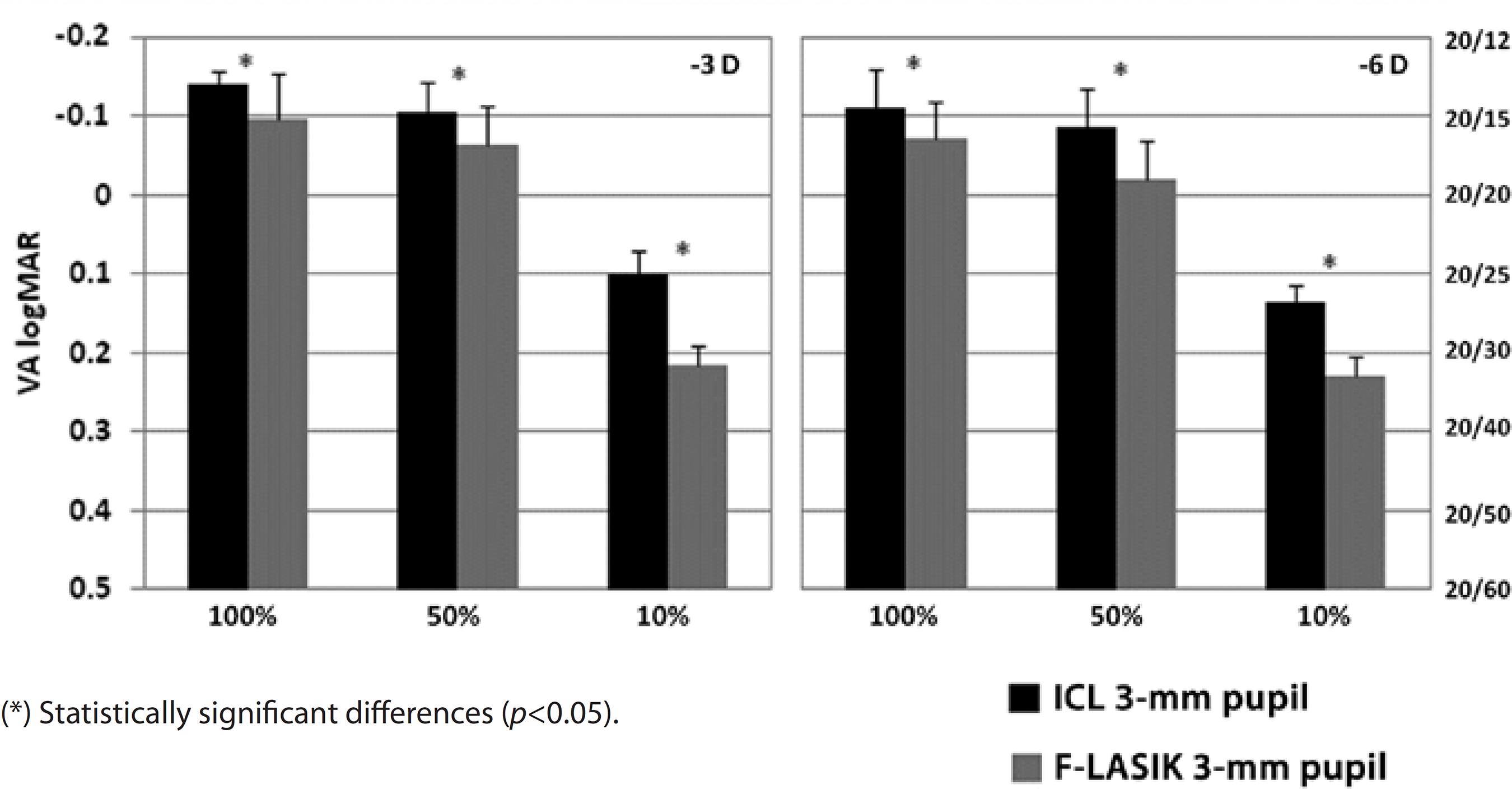 Figure 4 Visual acuity (VA) logMAR and fraction Snellen at high (100%), medium (50%), and low (10%) contrast, with ICL implantation (black bars) and femtosecond laser in situ keratomileusis (F-LASIK) (gray bars) for-3 D and -6 D and a 3-mm pupil. Errors bars represent the standard deviation (SD)