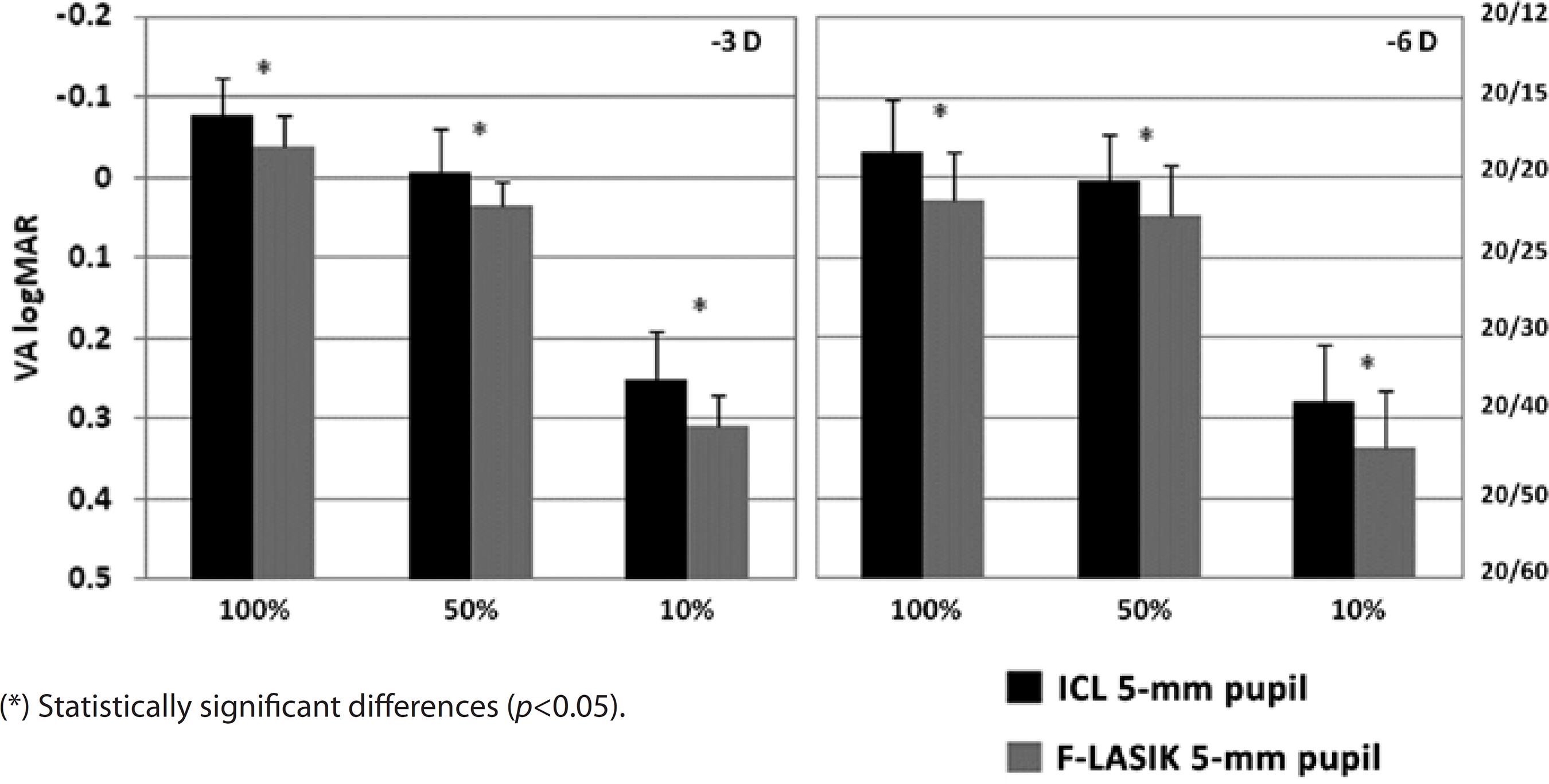 Figures 4 and 5 show VA for the -3-D and -6-D ICL implantation and F-LASIK at 3-mm and 5-mm pupil diameters, respectively. For both pupil diameters, we found statistically significant differences between the procedures at -3 D and -6 D and all contrast evaluated (p<0.05), thus showing better VA values for ICL implantation.