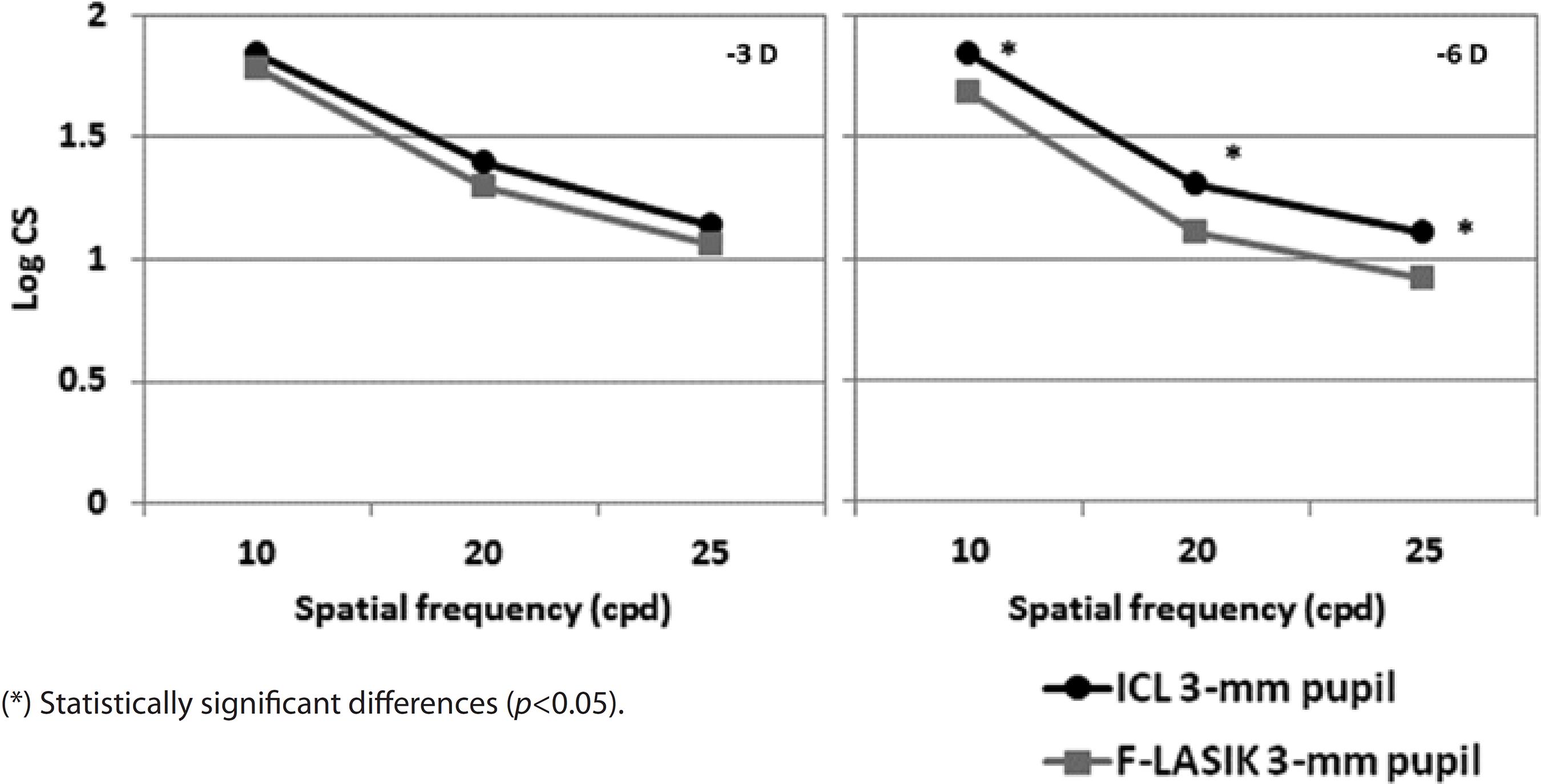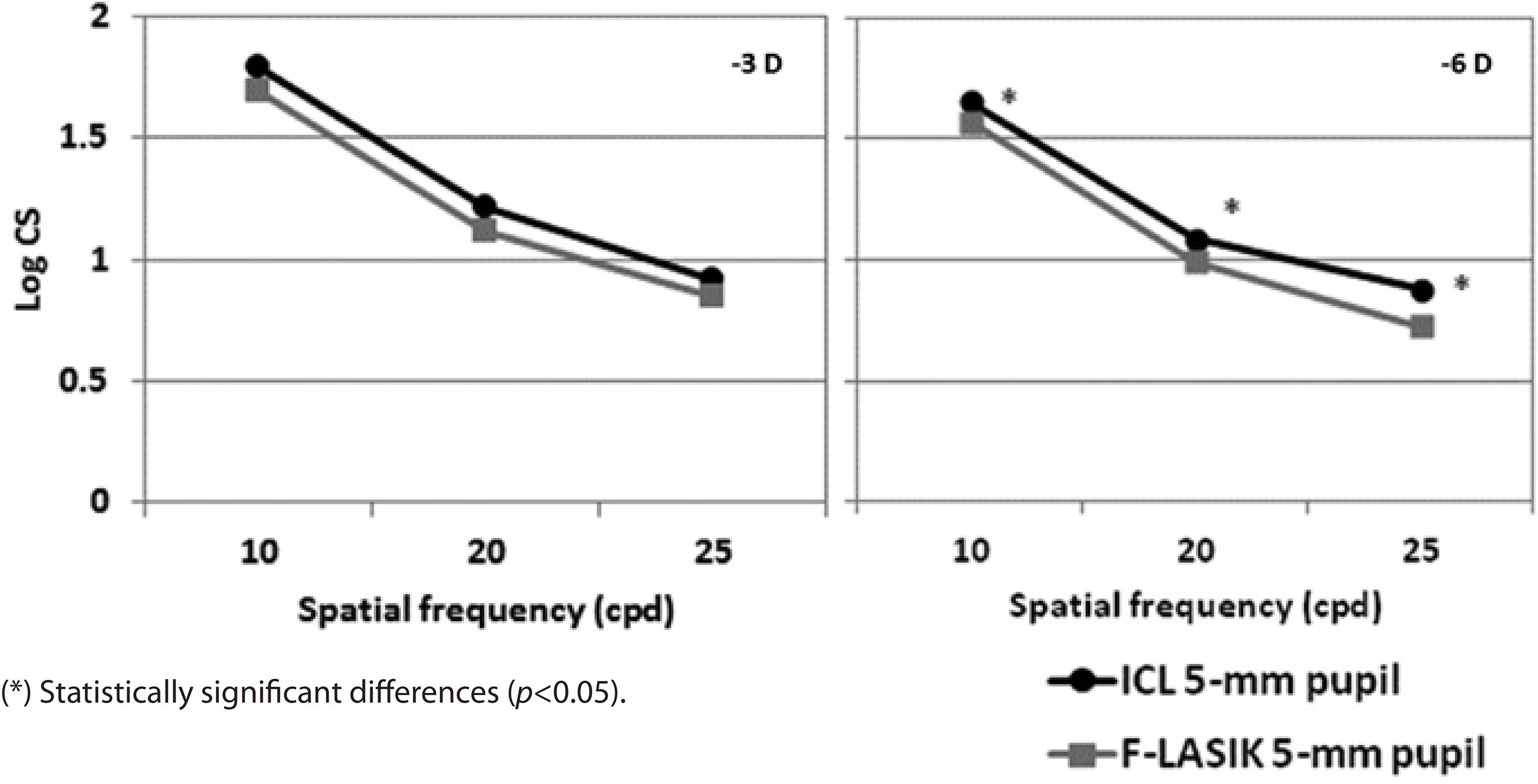 Figures 6 and 7 show the mean log10 CS values for the -3D and -6 D ICL implantation and F-LASIK for 3-mm and 5-mm-diameter pupils, respectively. For both pupil diameters, no statistically significant differences were found between procedures at -3 D for any spatial frequency (p>0.05). In contrast, we found statistical significant differences between both procedures at -6 D for both pupil diameters and all spatial frequencies (p<0.05). ICL implantation showed better outcomes than F-LASIK.