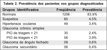 Foram diagnosticados 105 pacientes (7,3%) como portadores de glaucoma, sendo que 92 desses (87,6% dos diagnosticados como portadores de glaucoma ou 6,4% do total examinado) não tinham diagnóstico prévio da doença. Somente 13 pacientes portadores de glaucoma (12,4% dentre os diagnosticados) estavam cientes de sua patologia. Dos pacientes com glaucoma, 91 (6,3%) eram portadores de glaucoma primário de ângulo aberto (GPPA) sendo que 56 (3,9%) apresentavam PIO de triagem abaixo de 22mmHg e somente 7 estavam em uso de medicação hipotensiva. Oito (0,6%) pacientes apresentavam glaucoma de ângulo fechado e 6 (0,4%) glaucoma secundário. Outros 65 pacientes (4,5%) foram classificados como suspeitos de glaucoma e 49 pacientes (3,4%) foram classificados como hipertensos oculares. A prevalência dos grupos diagnosticados encontra-se na tabela 2.