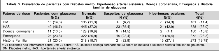 Em relação à prevalência de doenças associadas, 161 (11,4%) relatavam diabetes melito (DM) e 538 (38,0%) relatavam hipertensão arterial sistêmica (HAS). A prevalência dessas e outras patologias nos pacientes com ou sem glaucoma pode ser verificado na tabela 3. Não houve diferença significante na prevalência de DM, HAS, enxaqueca, doença coronariana e história familiar entre pacientes com ou sem glaucoma.