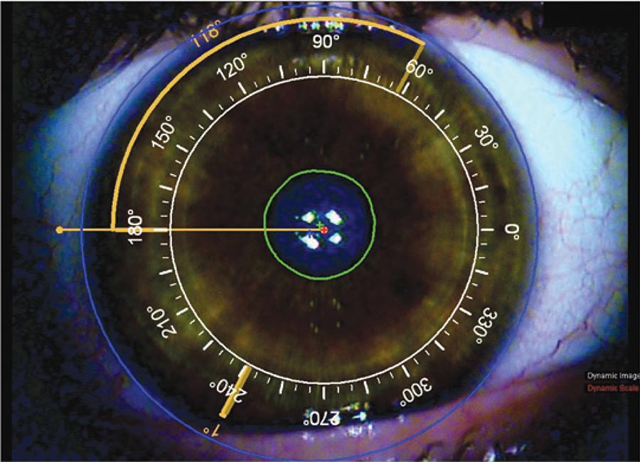 Toric lens misalignment is a concern, because the lens alignment is intrinsically related to its efficacy in correcting corneal astigmatism. Postoperatively, IOL misalignment from its intended position can be assessed using a slit-lamp with a rotating slit and rotational gauge. This method requires sufficient mydriasis to see the marks on the IOL optic. An obvious limitation in accuracy is the 10-degree steps on the slit-lamp's measuring reticule.
