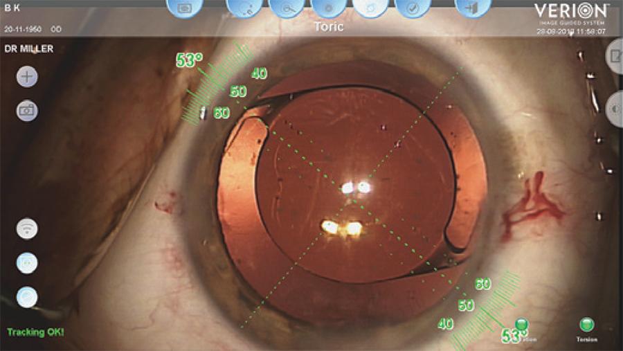 Alcon's VERION Digital Marker also uses a high-resolution preoperative image and intraoperative registration to guide toric IOL alignment without the need of preoperative ocular marking. The VERION system matches the preoperative photograph with the eye intraoperatively using scleral vessels, limbal vessels, and iris features. This facilitates proper reference alignment and tracking of the eye in real-time throughout the case. The intended toric IOL axis along with a limbal protractor is graphically aligned on a live view of the eye, being displayed on an external monitor or through the oculars of compatible microscopes. The toric IOL can then be aligned along the appropriate axis, guided by the digital overlay (Figure 3).