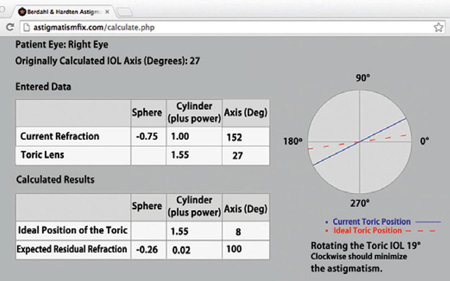 Figure 4 An example of an online vector analysis calculator (Berdahl & Hardten Toric IOL Calculator [www.astigmatismfix.com])49 that determines at which axis a toric intraocular lens (IOL) should be aligned to minimize the postoperative residual refractive astigmatism. In this case, the vector analysis is based on the patient’s postoperative astigmatic refraction and power and axis of the implanted toric IOL. By rotating the toric IOL from the 27° axis to the 8° axis, the residual astigmatism would decrease from 1.00 diopter (D) x 52° to 0.02 D x 100°