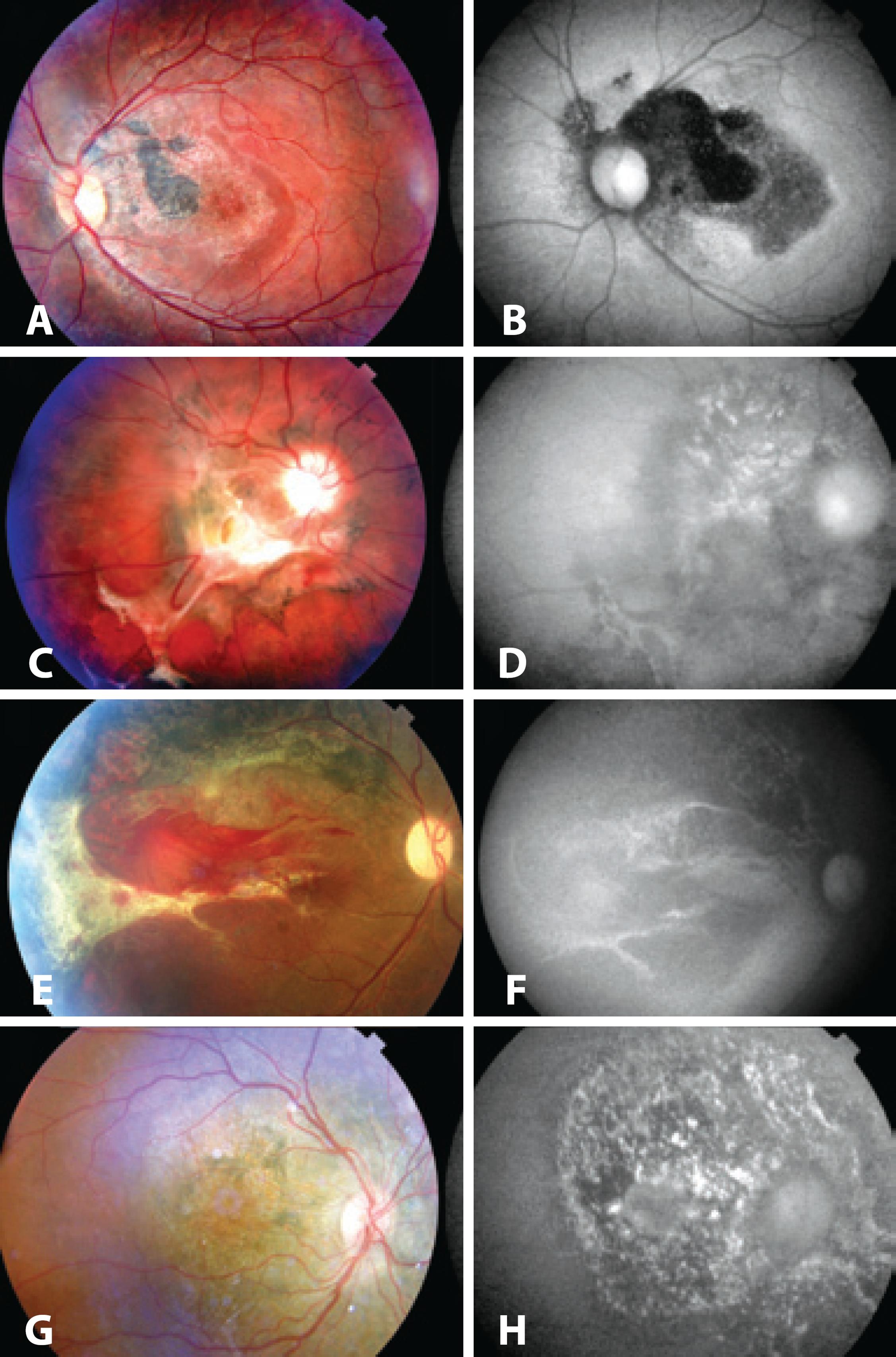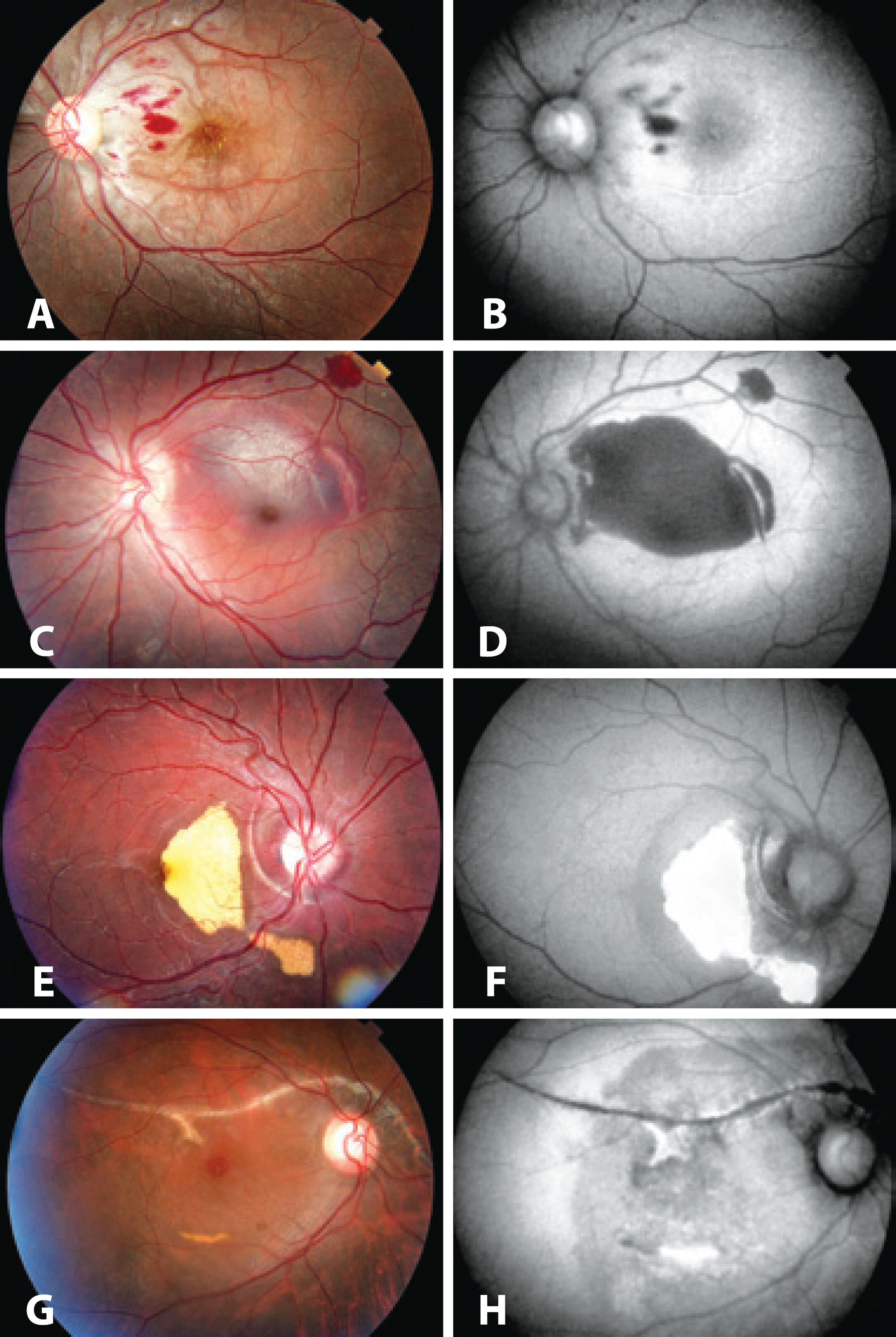 Figure 2 A) Hyperchromic lesion in the papillomacular bundle surrounded by hyperchromic and hypochromic pigment changes in the macular region. B) FAF exhibits a large hypoautofluorescent area affecting the macula. C) Choroidal rupture with extensive subretinal fibrosis, mobilization of the pigment in the posterior pole, and retinal architecture anomalies. D) FAF exhibits a hypoautofluorescent lesion with diffuse hyperautofluorescent areas affecting the posterior pole. E) Subretinal hemorrhage near the area of subretinal fibrosis affecting the temporal macular region. Toward the upper arcade, there is a change in RPR pigmentation. F) FAF exhibits a hypoautofluorescent area with diffuse hyperautofluorescent areas in the affected region, with a prevalence of hypoautofluorescent lesions. G) Slightly decreased RPE pigmentation in the peripapillary region. H) FAF exhibits a hypoautofluorescent lesion with diffuse hyperautofluorescent areas. In this case, FAF resulted in improved delimitation of the lesion compared with color fundus photography.