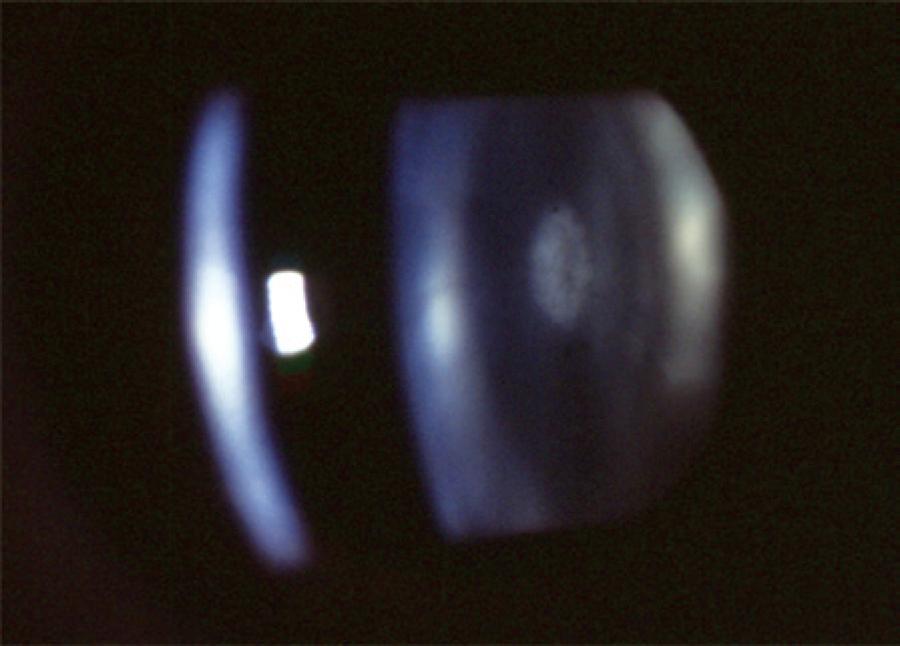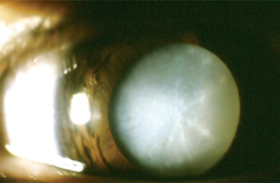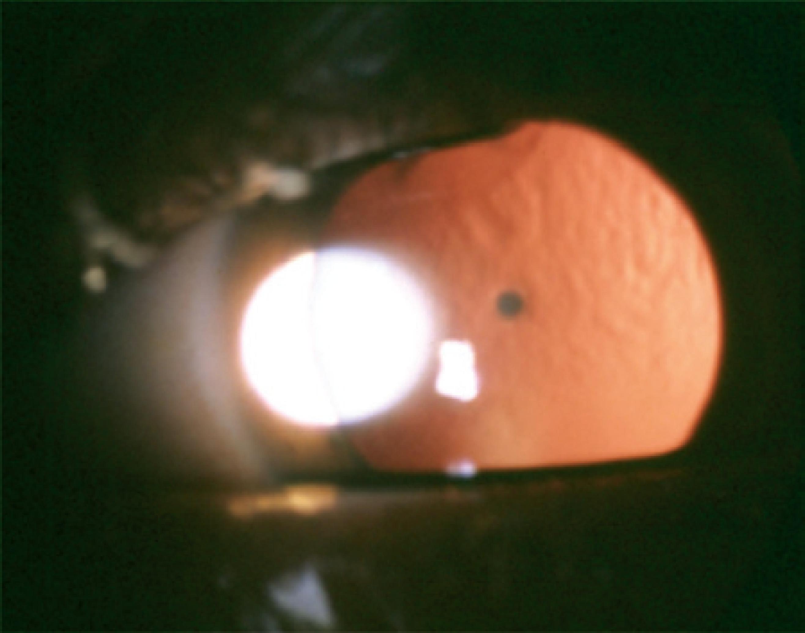 Cataract was classified according to the morphology as total (Figure 1), zonular, polar, capsular, and membranous. Zonular cataracts, which effect the fetal nucleus of the lens, were further classified as lamellar (Figure 2), pulverulent (Figure 3), nuclear (Figure 4), and sutural. According to the site of lens opacity, polar cataracts were classified as anterior, posterior, or pyramidal (Figure 5). Capsular cataracts were further classified as anterior, posterior, and lenticonus. When multiple morphological types of cataract co-exist in the same child or in the same eye, they are considered as mixed cataract.