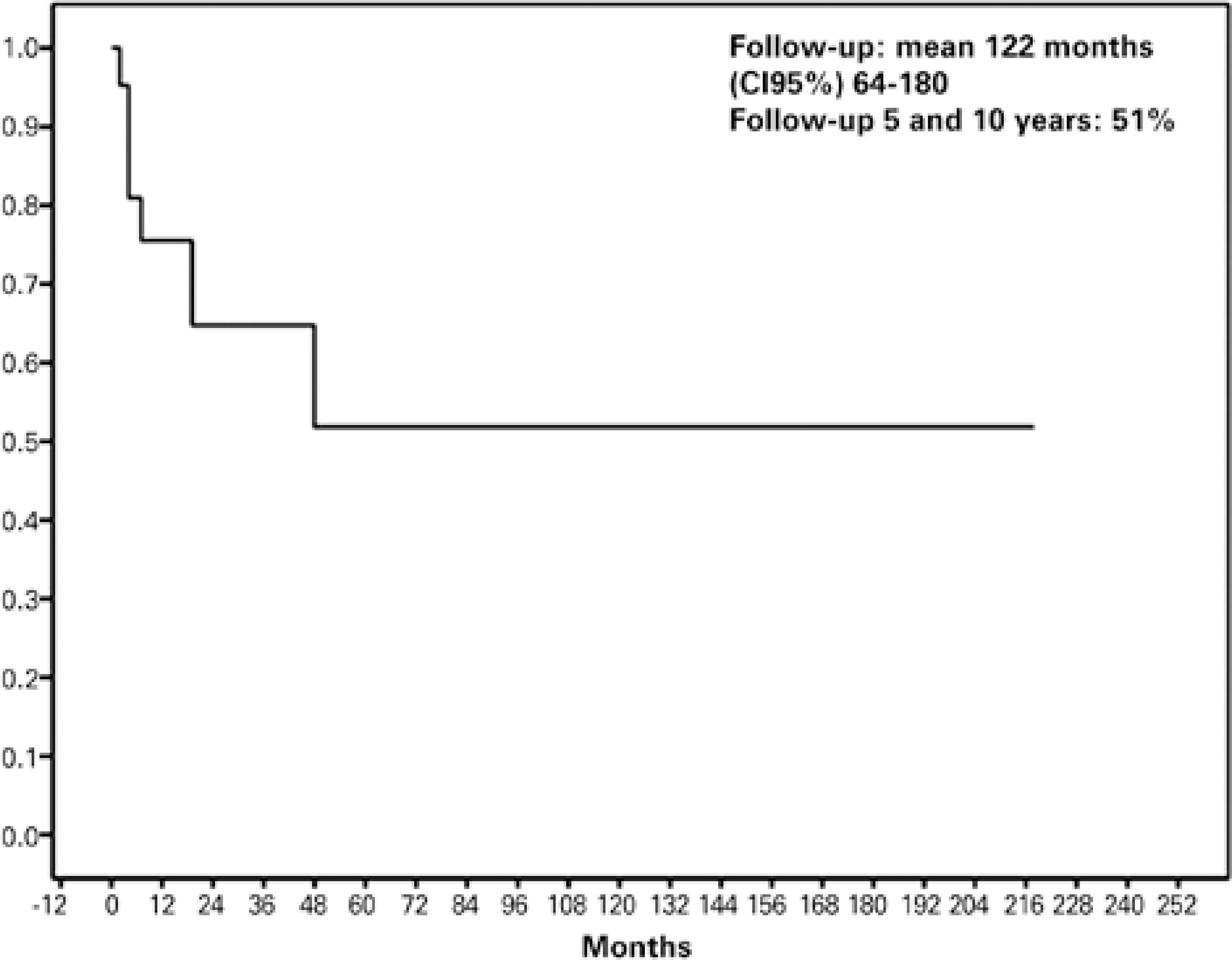 Figure 1 Disease free survival according to Kaplan-Meier. The mean follow up time was 122 months. The 5-years disease free survival was 51%.