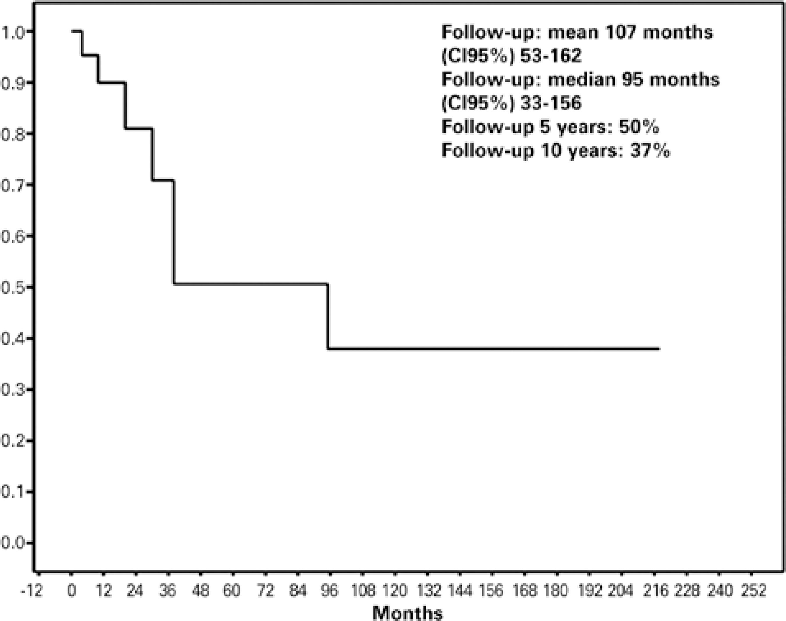 Figure 2 Overall survival according to Kaplan-Meier. The 5-years overall survival was 50% and the 10-years overall survival was 37%. The mean follow up time was 107 months.