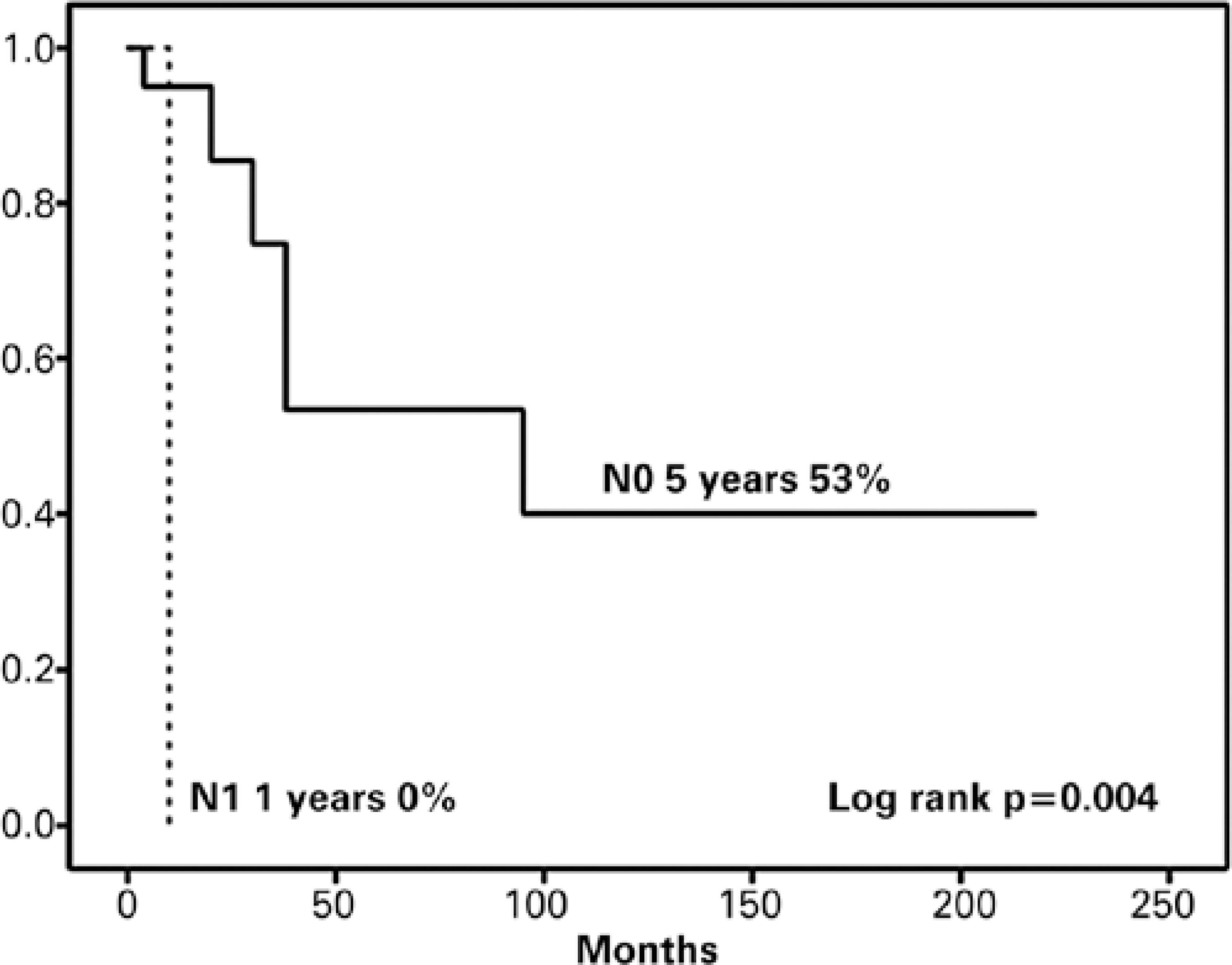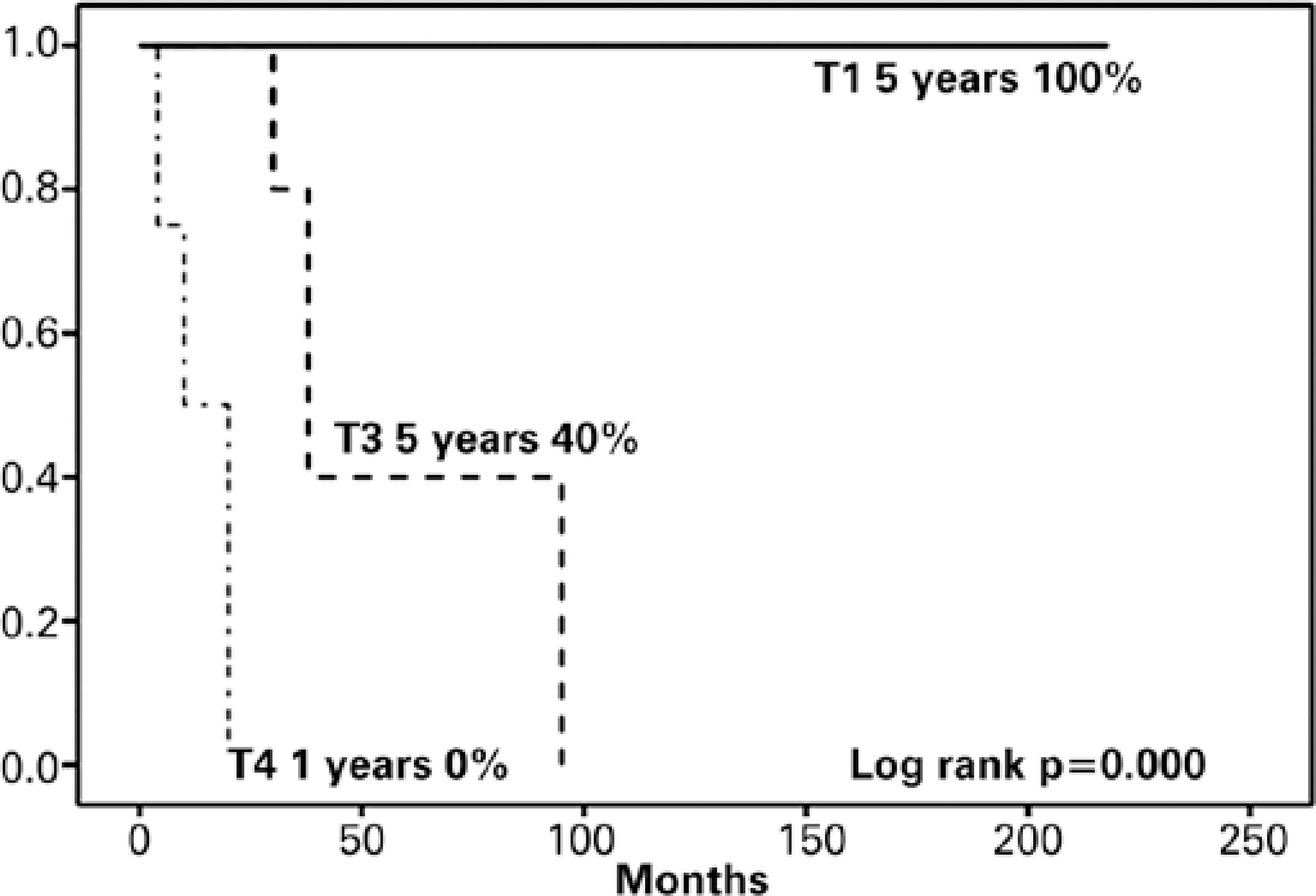 All patients had a diagnosis of melanoma confirmed by histology. One patient (4.54%) had bone infiltration. At clinical presentation, 6 patients (27.27%) were staged as T1, 12 patients (54.55%) as T3, and 4 patients (18.18%) as T4. One patient (4.54%) had metastatic disease at the time of diagnosis. The overall survival curves regarding T classification are shown in figure 1. One case (4.54%) had positive lymph nodes at presentation. The OS curve corresponding to the N factor is depicted in figure 2 (p=0.004).