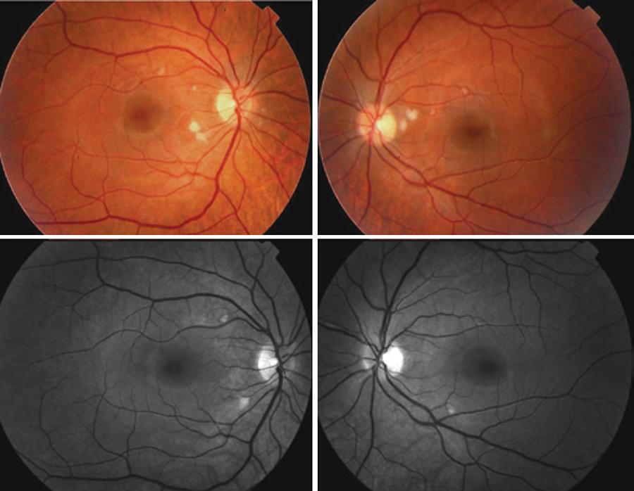 Figure 1 Color (upper) and red-free retinograph (below) of both eyes of patient 1 at 6-month follow-up treatment for hepatitis C, presenting with multiple cotton-wool spots without associated hemorrhage, smaller in the superior papillomacular bundle area and bigger in the inferior one.