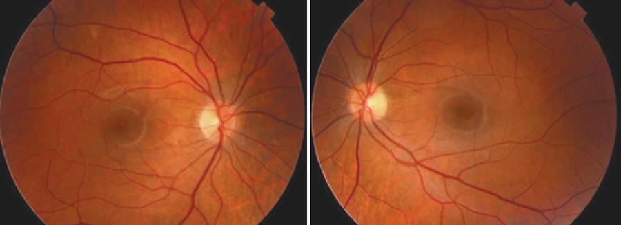 Figure 2 Color retinography of both eyes of patient 1 showing no retinal lesions at one year follow-up.