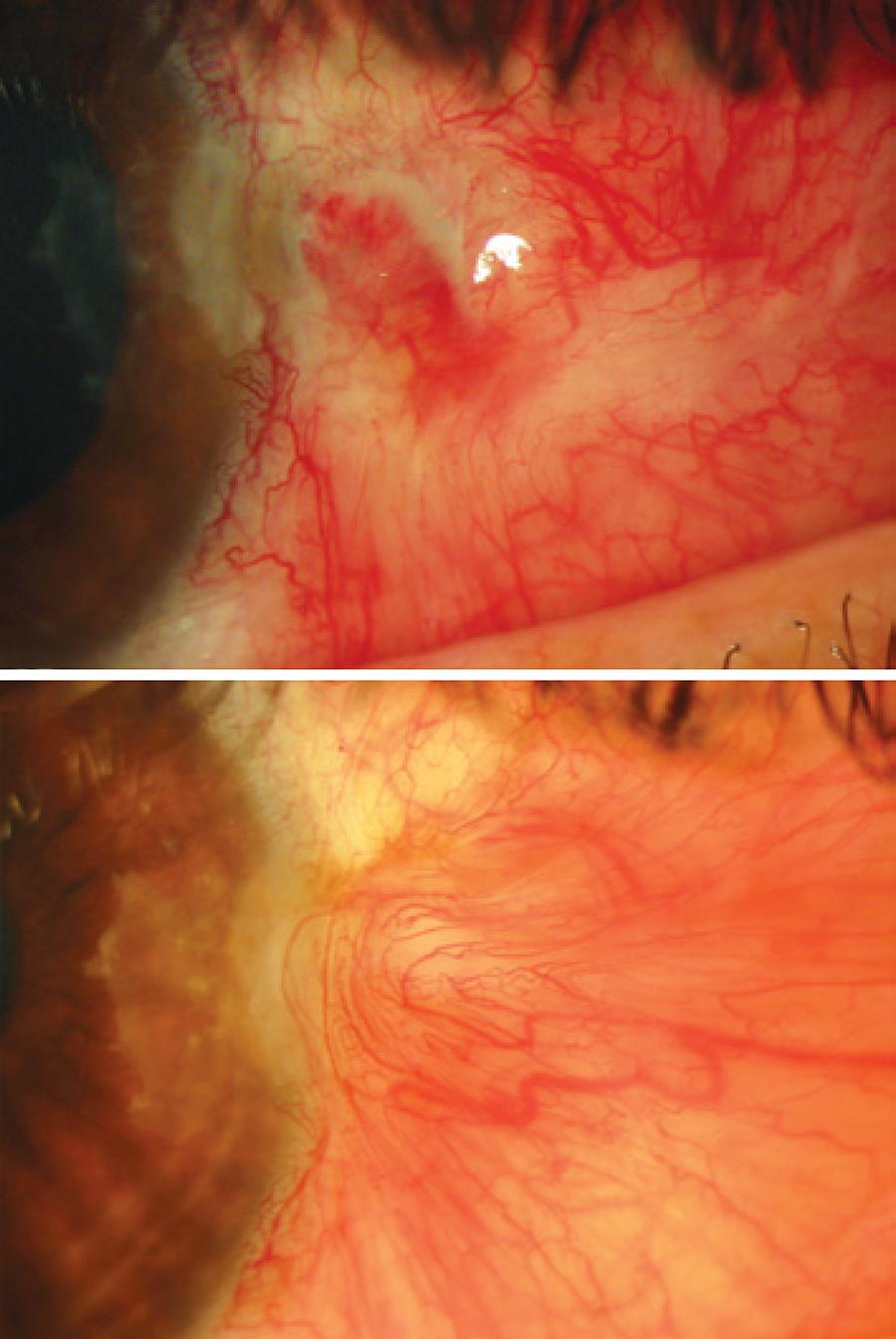 The fact that no stitches were found at about 1 week post-surgery suggests improper eye handling by the patient, excessively lax stitches, or a combination of both. The dehiscence of the wound, possibly resulting in exposure of the underlying sclera and edema, and raised conjunctiva edges, may have caused a discontinuity of the tear film leading to exacerbated local dehydration. In their publication, Chen and Noonan(2) attributed SD after pterygium surgery with the bare sclera technique to raised granulation tissue edges, which developed in the conjunctiva margin of exposed sclera.